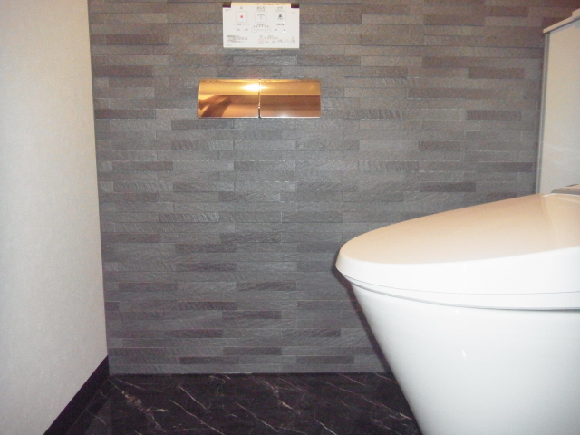 奥の壁に貼った『エコカラット』がポイントの、デザイン性の高いトイレに生まれ変わりました。タンクが中央の棚の中に収納されており、両脇の棚にはペーパーや掃除用具を収納でき、見た目もすっきりお手入れ楽々のトイレです。