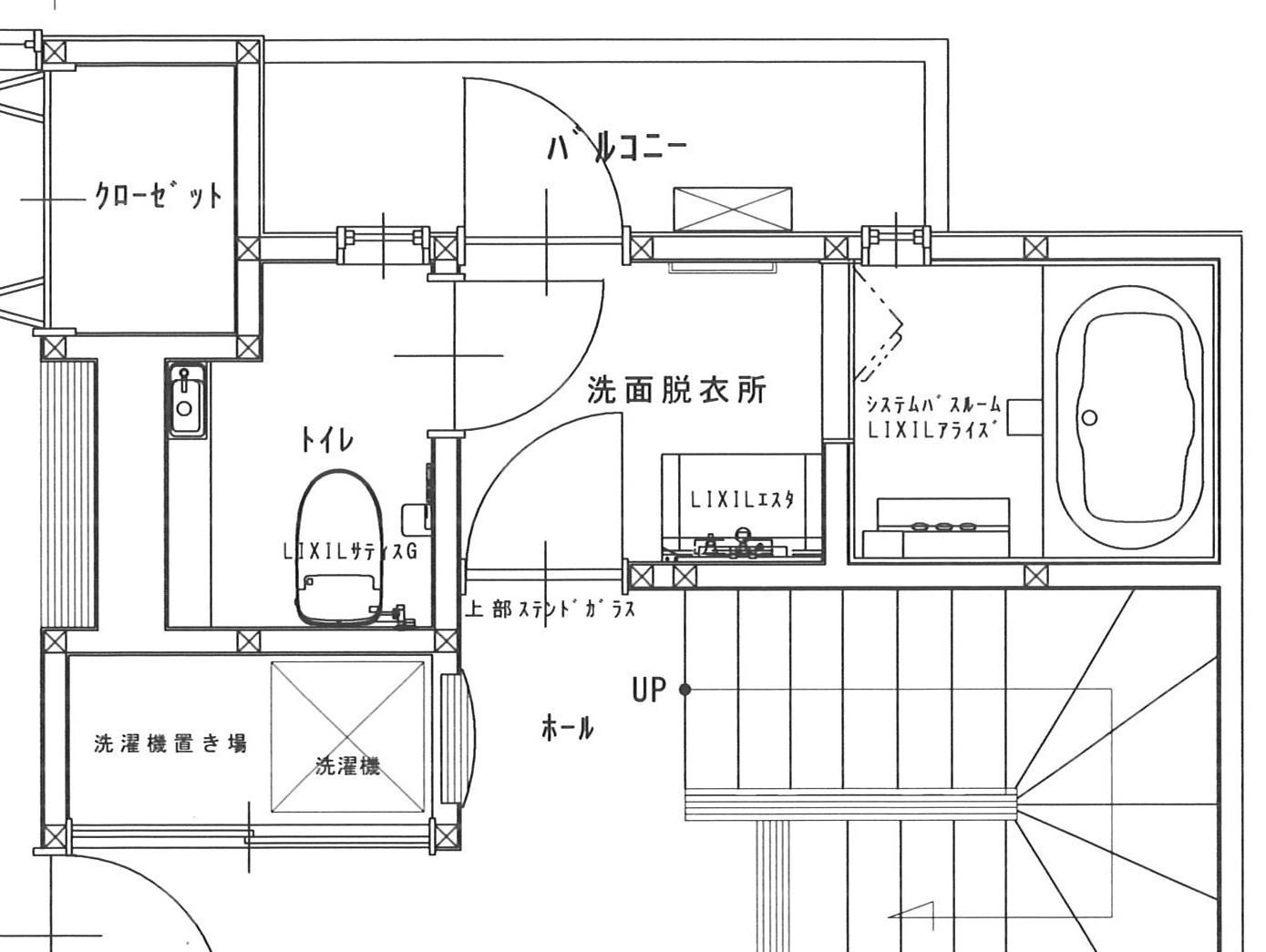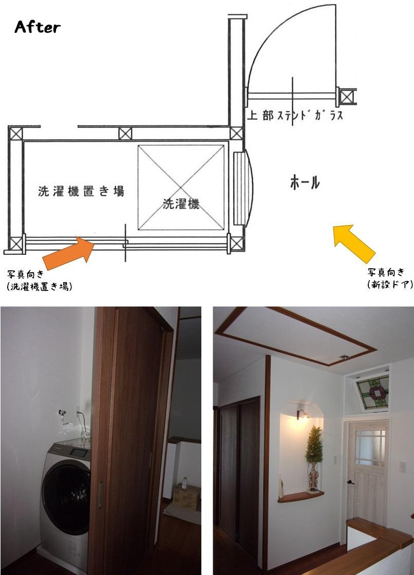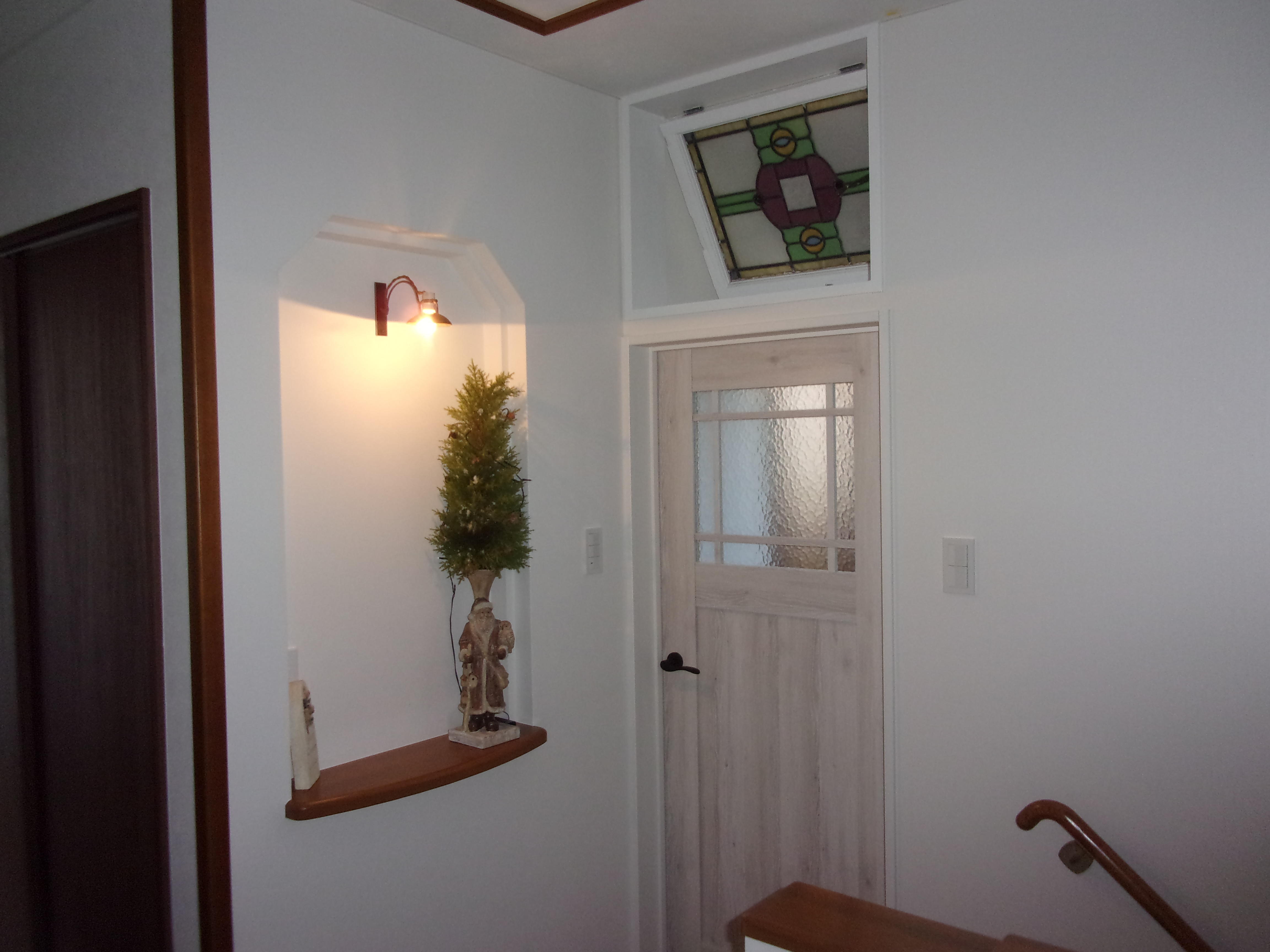 《採用建具》☆片開ドア☆LIXILラシッサD(右)☆引違戸☆LIXILラシッサ引違戸(左)洗面・脱衣室空間の広さの関係で洗濯機置き場の確保が出来なかったため洗濯機置き場を別に造作させていただきました。新しく造作しました片開ドアはY様が気に入ったステンドガラスに合わせて作成させていただきました。アンティーク調の白いドアとステンドガラスがとても上品でホールが明るくなりました♪階段上がった正面のニッチ(壁の一部を凹ませて、造り付けの飾り棚)壁内部にスッキリと物を飾ることができる空間です。お気に入りの飾りを飾ったりアイディア次第でうきうき出来る素敵なインテリアです。