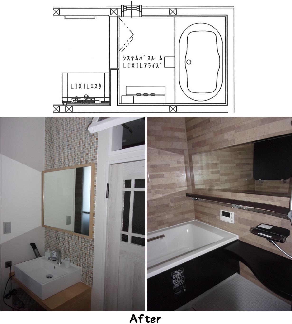 選定商品》☆ユニットバス☆LIXILアライズ 1316サイズ(右)壁パネル:セブストーン☆洗面化粧台☆LIXILエスタ(左) 【ユニットバス アライズ】施工前はシャワーのみの設備でしたが新しくユニットバスを採用させていただきました。壁パネルはLIXIL柏ショールームに展示されていたセブントーンが気に入られて採用させていただきました。アライズは『もっとお風呂が好きになる。』をコンセプトに進化したバスルームです。【洗面化粧台】シャワールームからユニットバスルームに変更したため、脱衣室の広さが狭くなってしまいましたが、採用商品の『エスタ』はそんな場所に最適な奥行コンパクトで様々な場所に美しく収まるコンパクトドレッサーです。トイレに使用したタイルと同じものを施工して統一感も出しました。収納キャビネットも色々と選べ、インテリアとしても非常に優れた洗面台になります。お客様のコーディネート次第で色々な表情を見せてくれます。