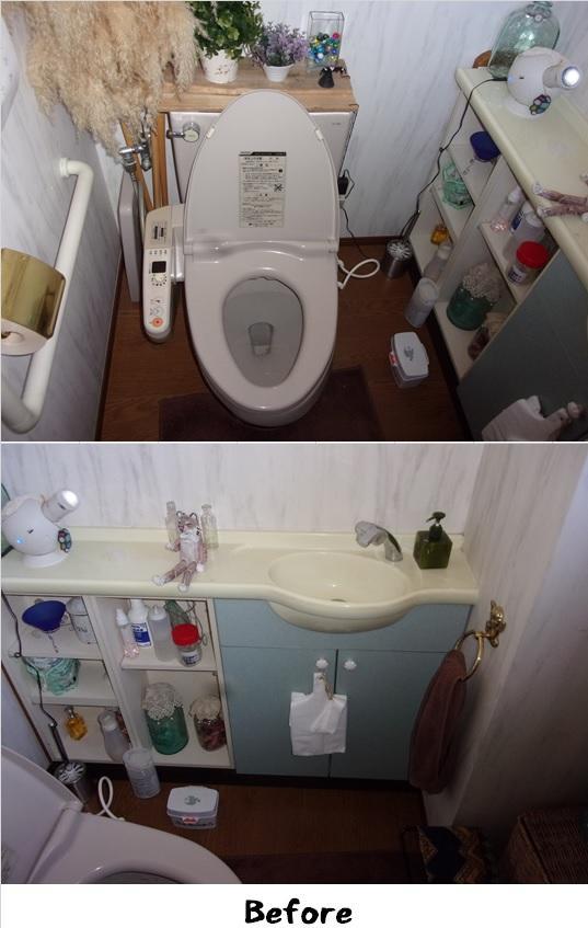 施工前のトイレは収納の扉が無い分物がゴチャゴチャしがちになってしまい雑貨についたほこりなどお掃除するのも大変そうでした。やはりトイレはほこりなど立ちやすいのでお掃除が簡単にできトイレもコンパクトにして清潔でゆったり落ち着く空間にします!