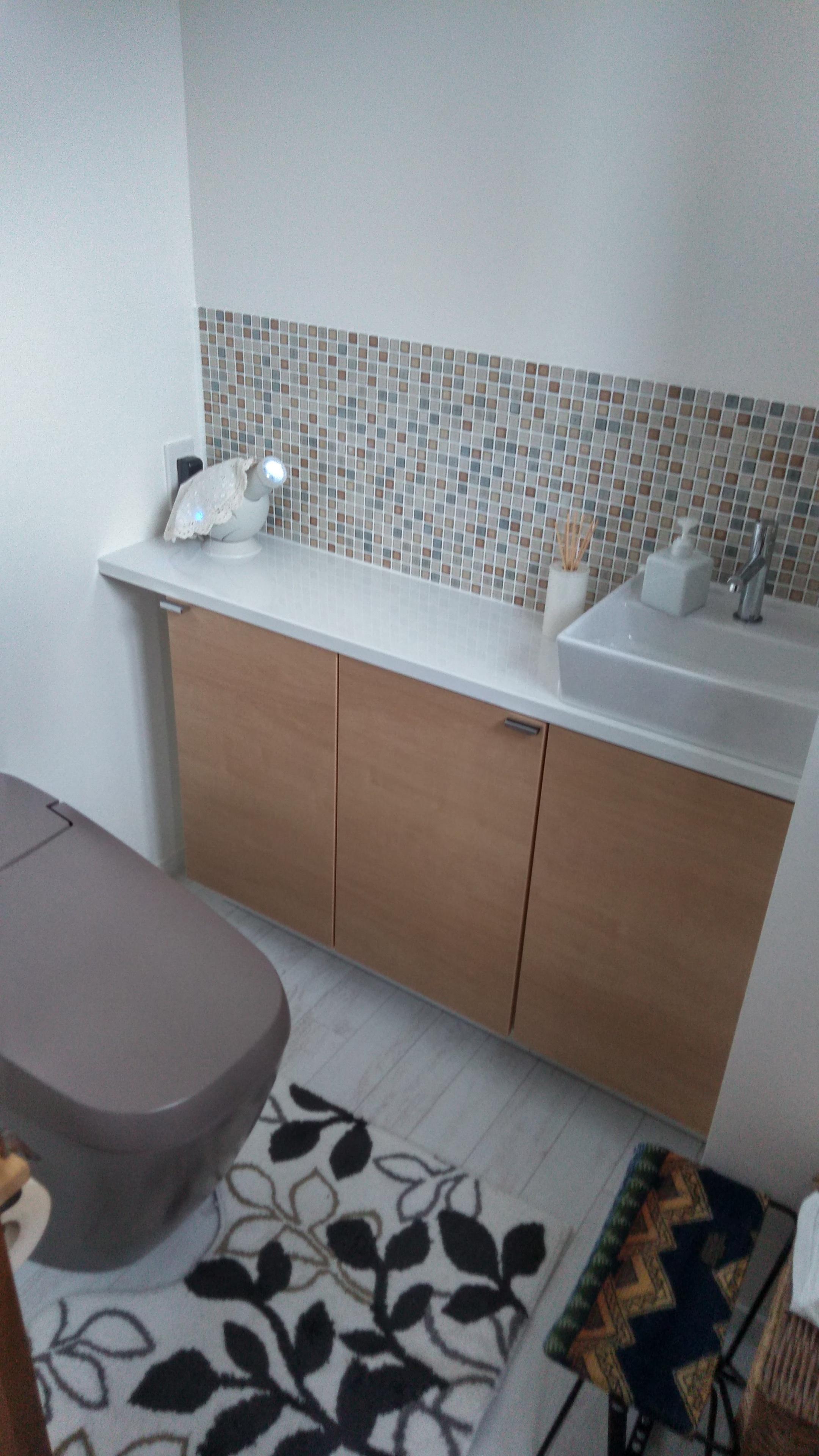 《採用商品》☆トイレ☆LIXILサティスGタイプ カラー:ノーブルトープ☆手洗+収納☆LIXILキャパシア・ベッセル型ナチュラルカラーの壁タイルに、やさしい木目のキャビネット。そこに【ノーブルトープ】(ニュアンスのある中間色で、グレイがかったブラウン)のサティスGタイプを組み合わせることで、落ち着いて品のある北欧風に。収納もしっかりたっぷりあるのでゴチャゴチャも解消されゆったりと空間を楽しみながら、心を豊かにし、オンとオフの切り替えもスムーズにしてくれます。