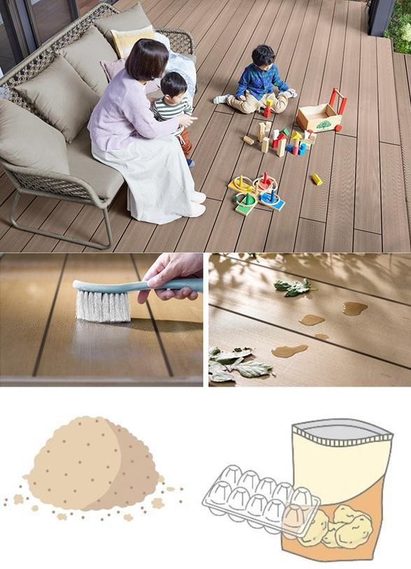 《LIXIL デッキDC》LIXILは、熱伝導率の低い樹脂素材と独自の新技術「独立気泡構造」を取り入れ、夏場の炎天下でも熱さを感じにくい笹最先端の人工木デッキです。デッキDCは、暑い日にデッキが熱くて使いづらいという人工木デッキの課題を解消し、天然木のように熱さを感じにくい使用感を実現。熱伝導率の低い樹脂素材と独自の新技術「独立気泡構造」を基材部と表層部に採用することで、「熱伝導率」と「熱容量」を抑制し、従来の人工木デッキよりも約4度熱く感じにくいデッキを実現しました。この気泡構造により、優しい肌触りで小さなお子様も安全に遊ぶことが出来ます。《お掃除ラクラク、耐久性も抜群》従来の木製デッキですと真夏の日差し、雨や雪、シロアリなどにより劣化が進み、ささくれやひび割れ、腐食などおこってしまい、怪我や、事故のもとになるケースもありましたが、こちらの「デッキDC」は簡単に掃除でき木製デッキと比べて経年劣化によるメンテナンスが最小限で済みます。《SDGsなウッドデッキ》LIXILでは、環境ビジョン2050を掲げ、資源の循環利用を促進している。デッキDCの基材部には、製造工程で発生する木粉や木くずと、自治体が回収・再生した再生プラスチックを原料とし、リサイクル材を100%使用した環境に配慮した製品となっています。