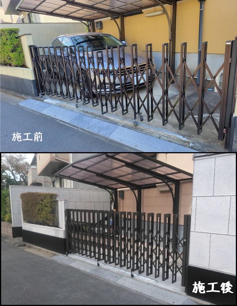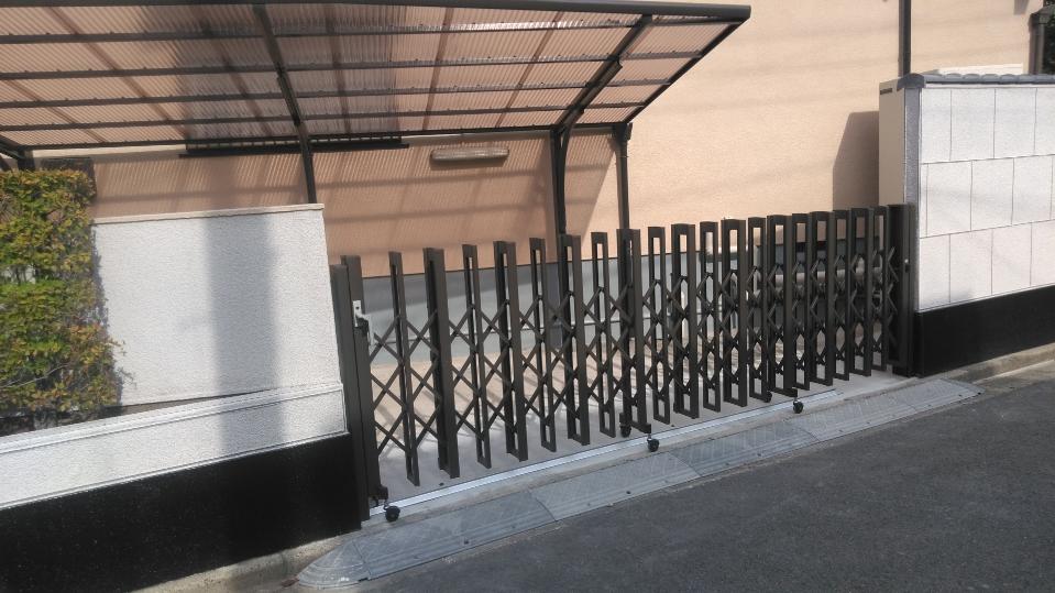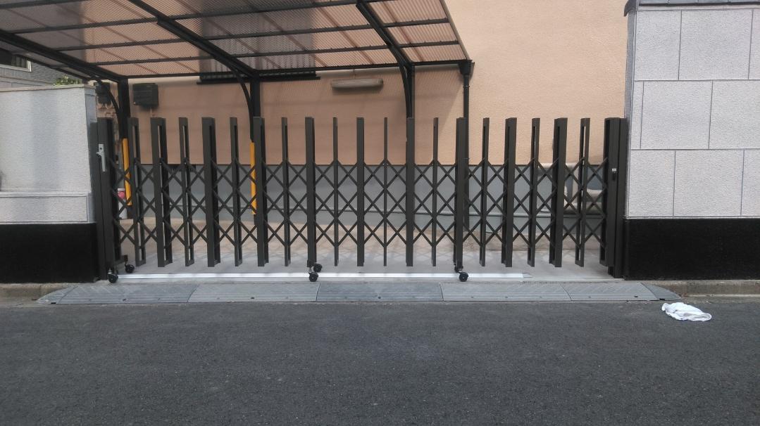 施工前の収縮門扉にはレールがなかったため開くと動いてしまうので今回はセンターレールを施工させていただきスムーズに収縮できるようになりました。