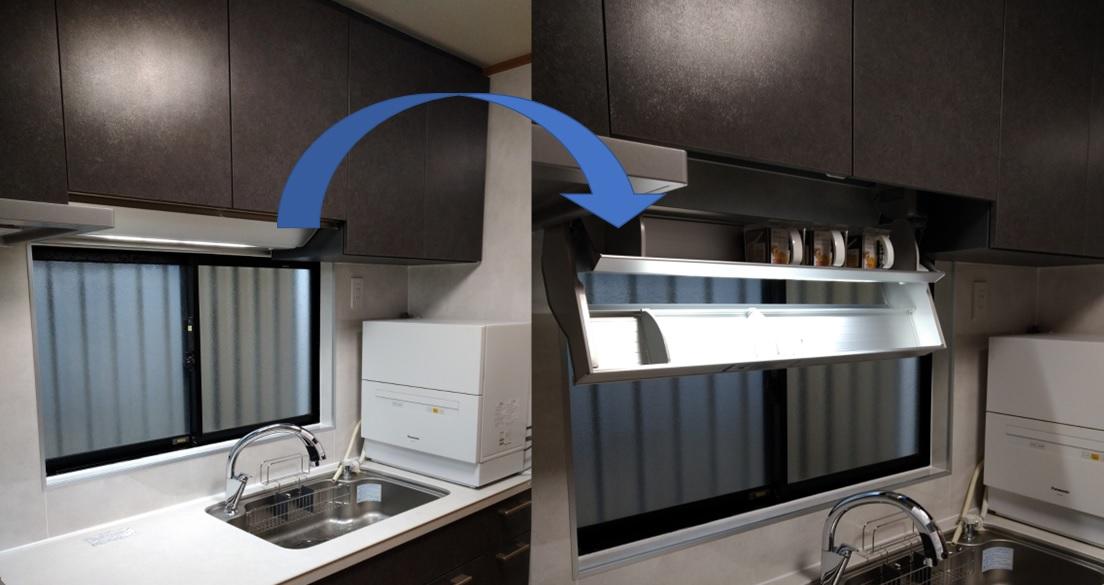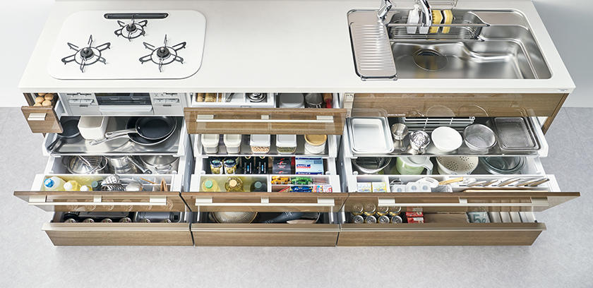 忙しいときも効率よく調理ができ、なおかつ収納も多い『らくパット収納』で道具の取出しも簡単にしたい!