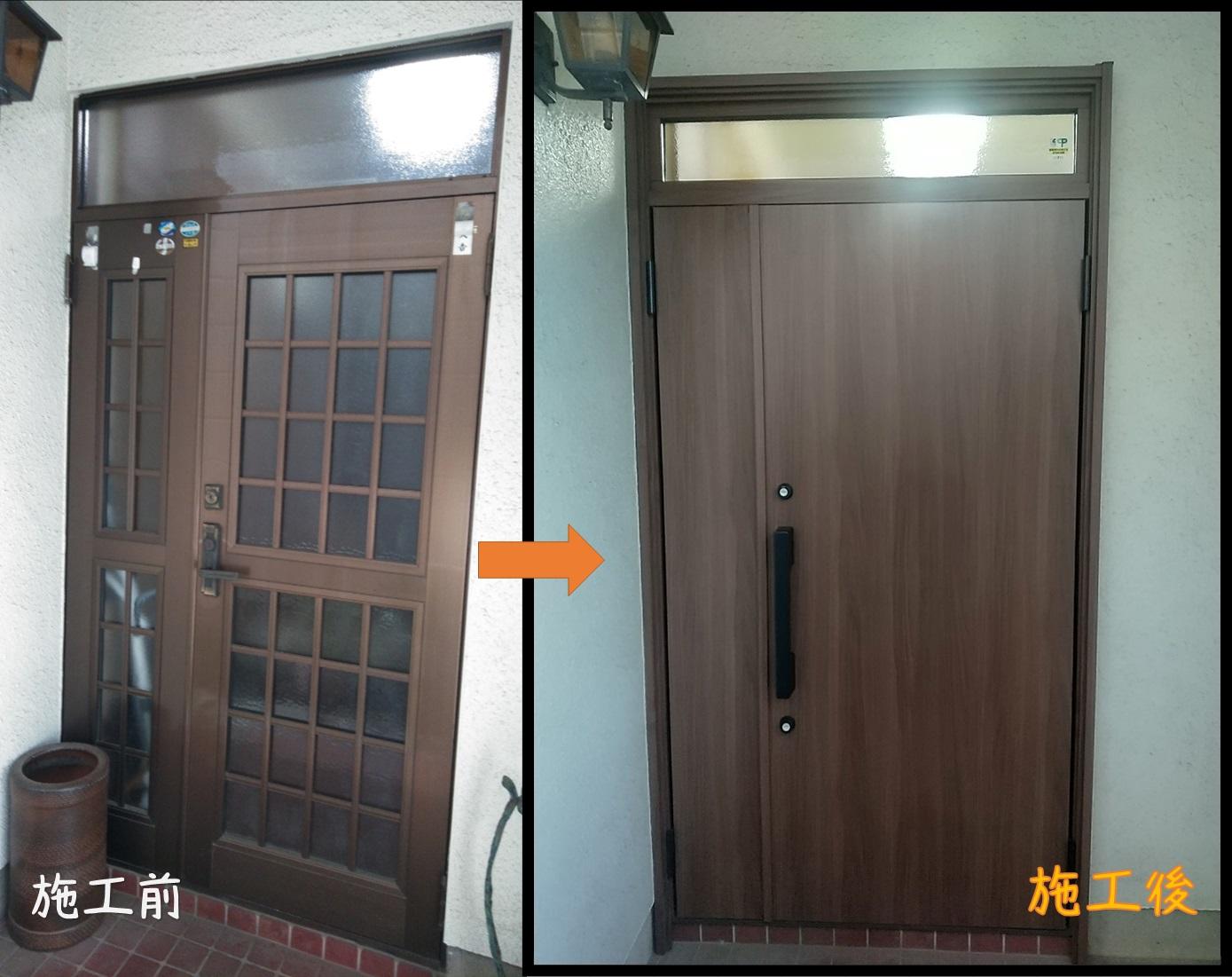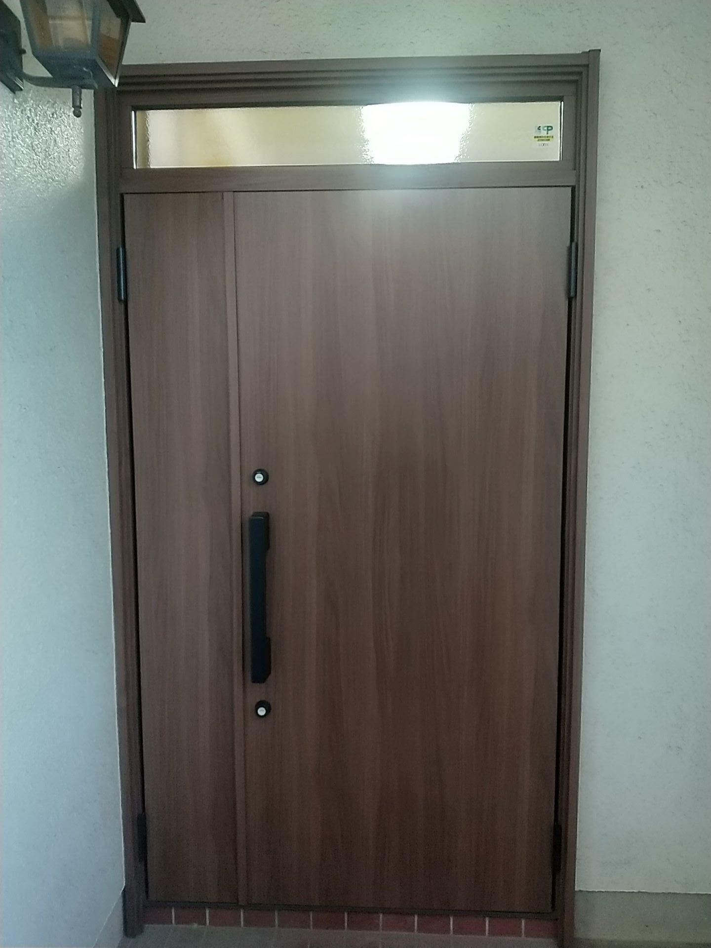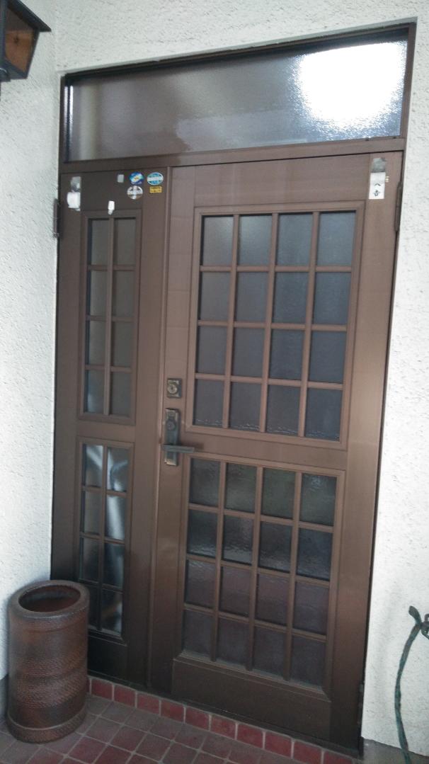 施工前の玄関ドアはガラス面が多くとても玄関は明るくなりますが、ガラスを割れたヶ所から腕を入れサムターンを回し空き巣に入られた原因にもなりました。その為お客様のご要望でガラス面の少ないドアを選定させていただきました。