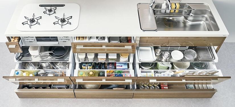 ☆リフォームのきっかけ・ご希望☆ 設備機器劣化に伴うキッチン交換工事 吊戸のないタイプのキッチンでも収納スペースを多くとれるものでなおかつ使い勝手の良いものにしたい。
