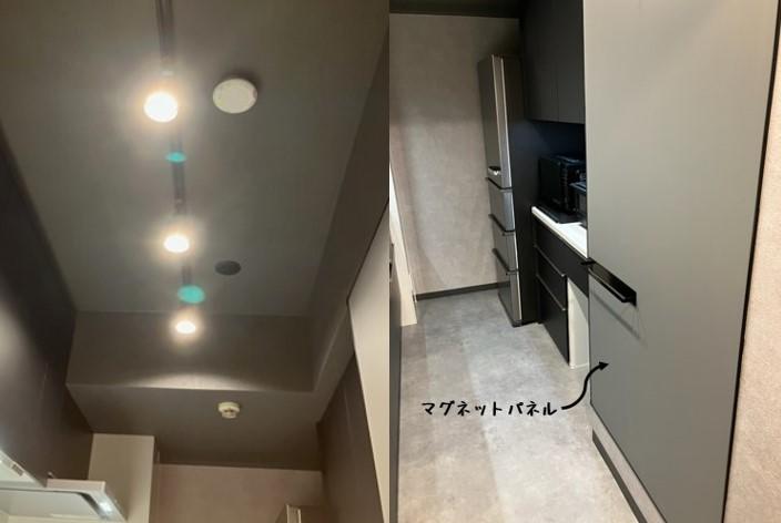 ★キッチンの照明には『ダクトレールスポットライト』を採用全体を照らすシーリングライトとは違い特定の場所をピンポイントで照らし照明の角度を変えれば模様替えをしたかのようにお部屋の表情が変わってきます。スポットライト自体もおしゃれなデザインが多いので照明ですがインテリアのアクセントとしても役立ちます。★キッチンの背面にはカップボードと『マグネットパネル』を施工しました。このマグネットパネルはとっても便利!ついつい冷蔵庫に貼ってしまうメモなどついついごちゃごちゃしてしまいがちですが、このおしゃれなマグネットパネルが大活躍してくれます♪自由に場所を変えられるマグネット式のタオル掛けや、色々なマグネット式の便利なアイテムを使いお客様の好きなようにアレンジを楽しむ事ができます♪