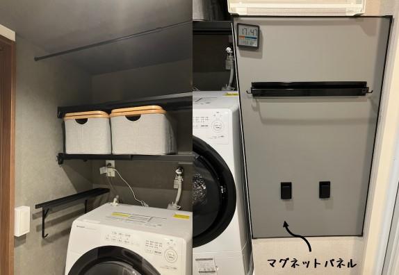 洗面室の棚や小物類はお客様が気に入ったものをご用意して下さり施工させていただきました。こちらでもマグネットパネルを採用し自由にレイアウトを変えることができるのでおススメの商材です。