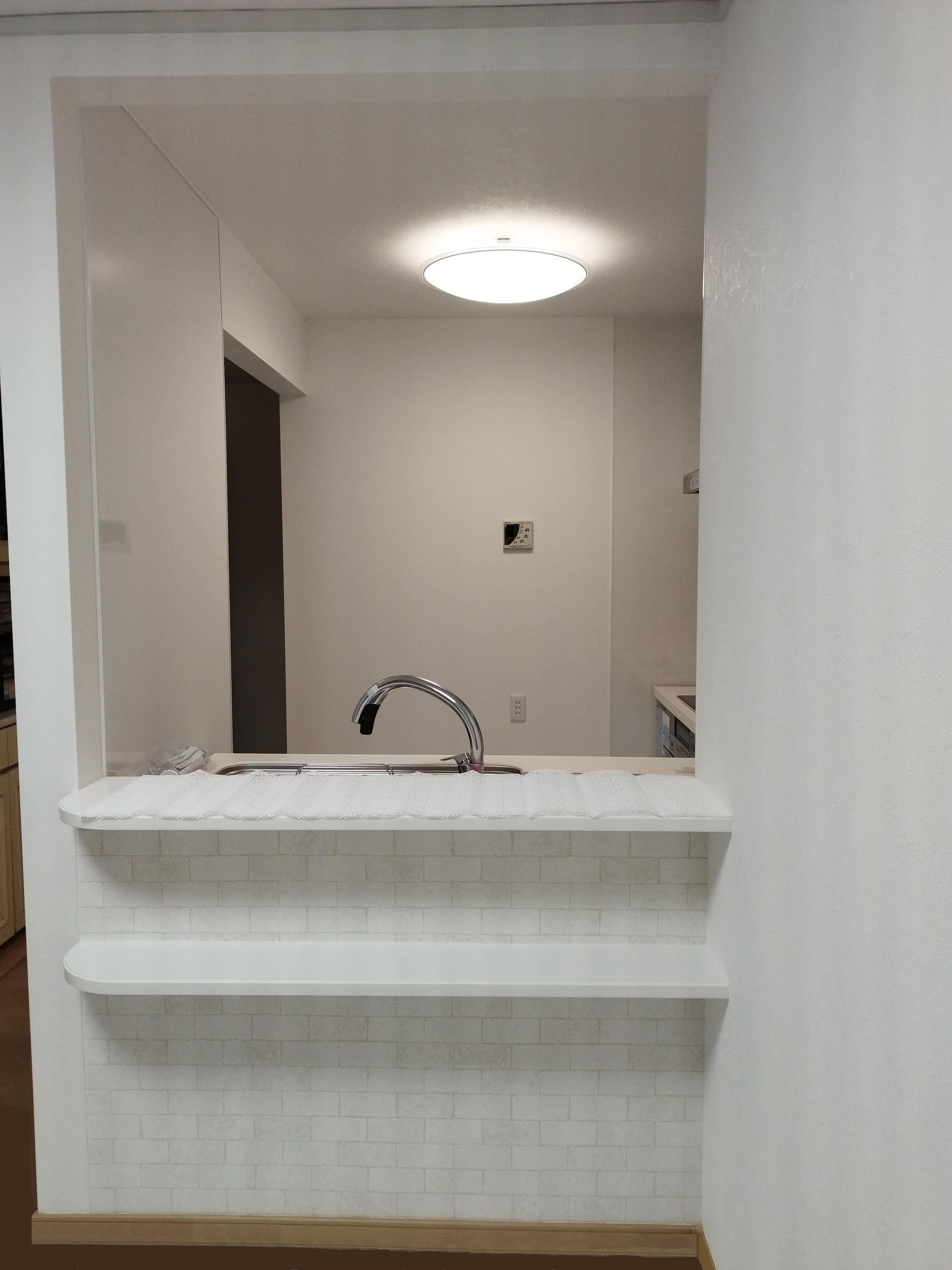 キッチン対面の開口部の高さを大きくしました。開口部を大きくすることにより自然な光が入り込むことでキッチンがとても明るくなりさらに開放感が広がります。タイル調のアクセントクロスを使用することにより開口部のポイントとしました。お客様の選ばれたリシェルSIの白いキッチンがさらに輝きます♪