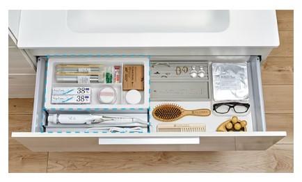 スッキリ整頓できる収納はフルスライドタイプに洗面小物をすっきり収納できるスマートトレイ(樹脂製・金属製)を装備。熱に強い金属製トレイには、熱いヘアアイロンもしまえます。