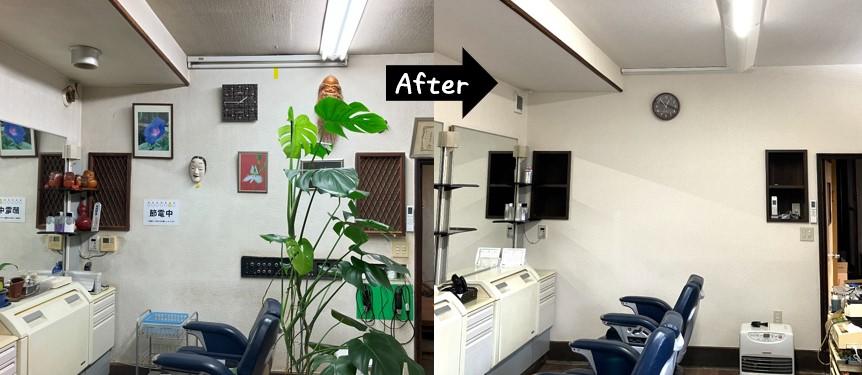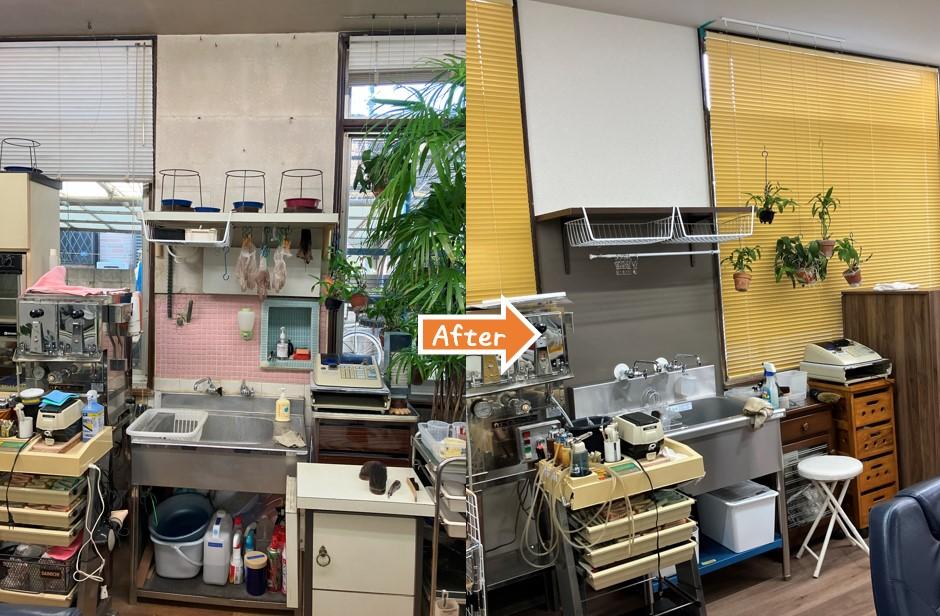 昔の面影を残しつつパッと明るく使い勝手の良いいフォームをご提案させていただきました!約60年間の色々な思い出の詰った店舗です、大切に使ってきた設備の使える部分は残しつつ、壁に埋め込まれていたオーディオ設備を取り外し、穴を塞ぎ清潔感のある白いクロスを貼りました。両脇にあるスピーカーがあった部分は可動棚として再利用させていただきました。スポットライトも撤去させていただき換気扇も交換しました。