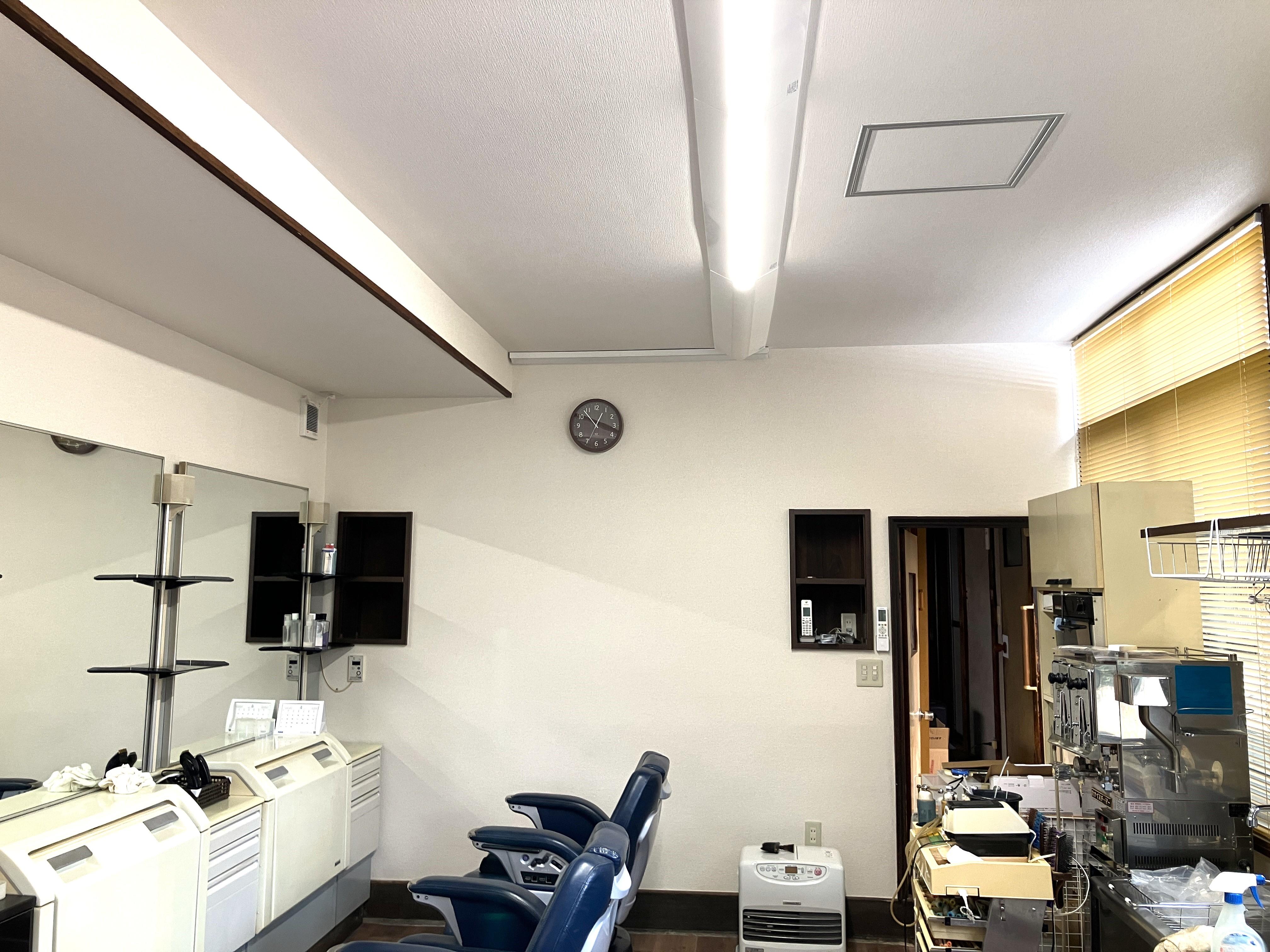 床の貼替は、過去に部分的に張り替えたヶ所やお店の入口段差などを解消する為コンクリートが見えるところまで剥がしてレベル調整しました。フローリング調の長尺シートに貼り換えました。長尺シートは摩擦に強く土足で歩く場所や店舗、公共施設などに使われており、転倒時の衝撃を吸収するクッション性のあるものなど多岐多様に種類がございますので、店舗に限らずお部屋の用途にピッタリの長尺シートを見つけることができます♪