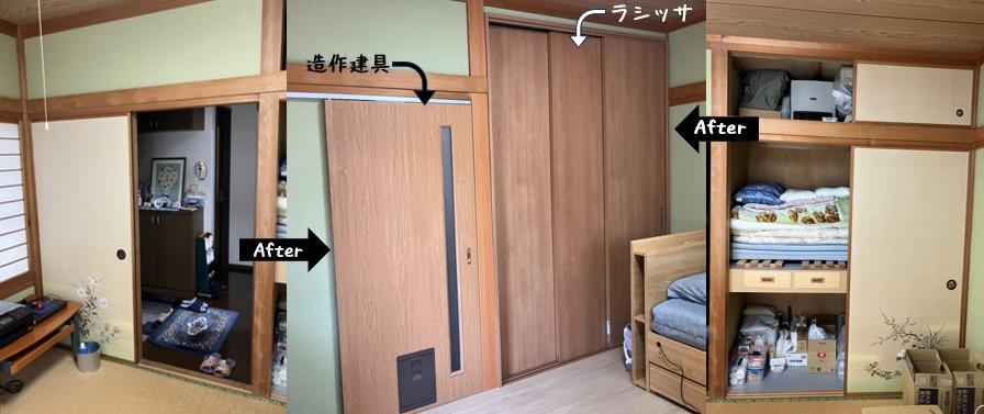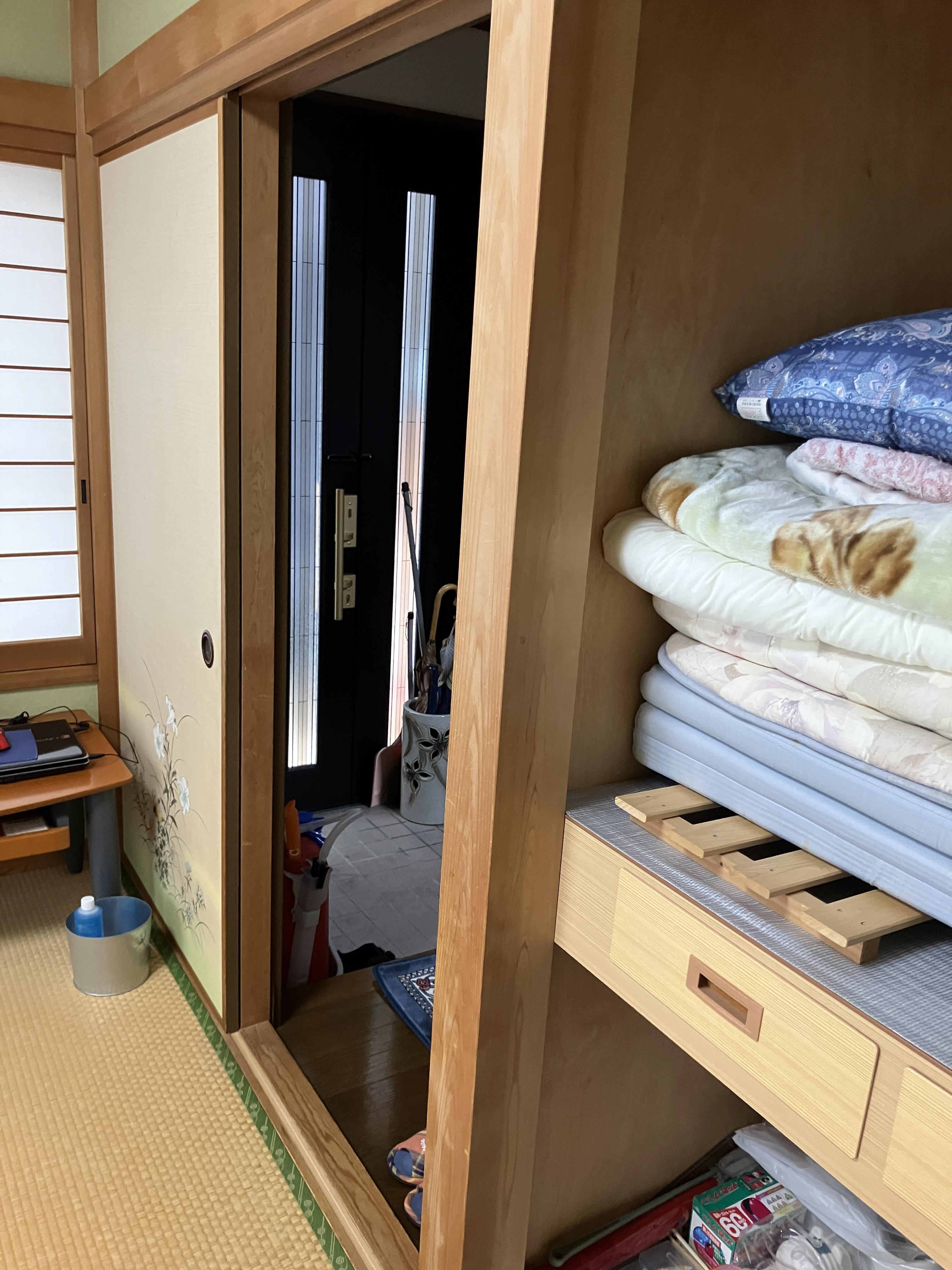 【採用建具】造作建具 建具屋さんに造作してもらった吊レール式戸襖。段差があるため躓きやすく危険な敷居を撤去。壁は最小限にカットしました。吊レールにすることにより戸がとても軽くなり開け閉めがとても楽になります。毎日使う建具ですから力を使わず楽々が一番です♪【クローゼット 外・内採用建具】外 三枚引き戸:『LIXIL ラシッサS』 (色:クリエペール)ラシッサ S は合わせやすい色目で幅広くオーソドックスなインテリアをカバーするクリエカラーが特徴です。溝やレールのない上吊り方式やアウトセット方式の引き戸もあり、バリアフリーの観点から、上吊り方式やアウトセット方式の引き戸を採用するケースもあります。