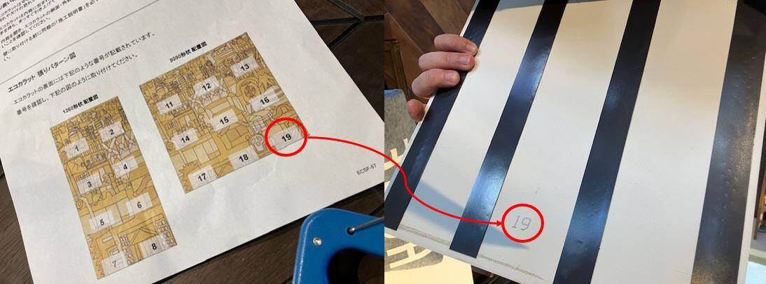 ③セット内容に入っております『取り扱いのご注意・パターン説明書』にエコカラット張りパターン図がございますのでエコカラット裏面の番号を確認しながら取り付けます。