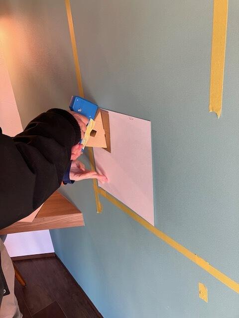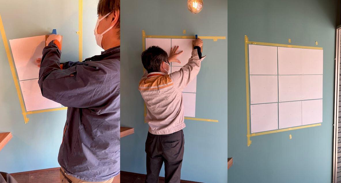 ①まず取り付け可能な下地かチェックをし、貼る位置にマスキングテープで印を付けます。