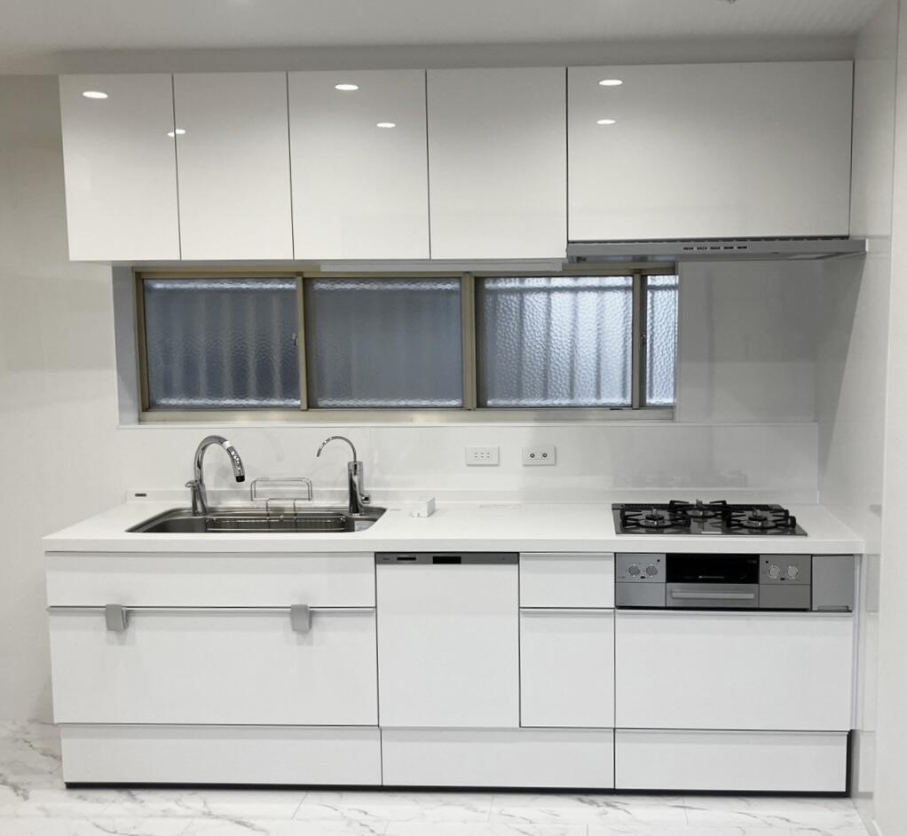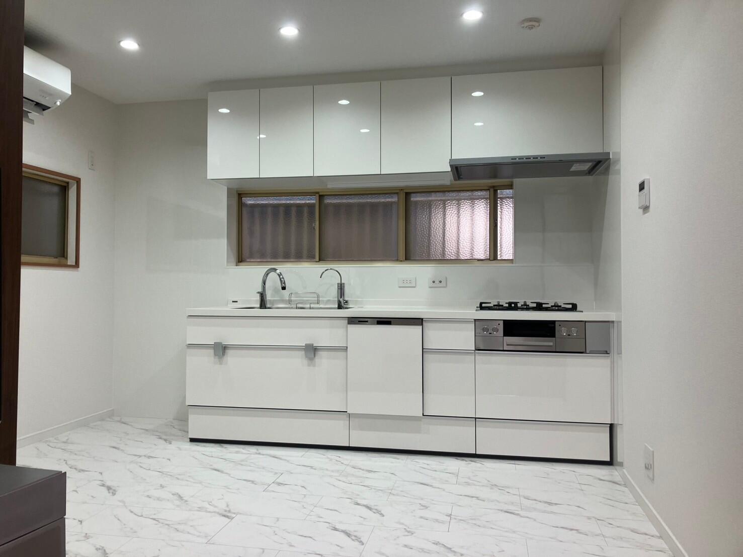 【採用キッチン】『LIXIL ノクト』W2550(色:扉カラー:ミストホワイト ワークトップ:人造大理石トップ ベーシックホワイト)ノクトはキッチンリフォームの気になるポイントを解消してくれるキッチンです!まず、『収納力』調理道具がたくさんあっても大丈夫。奥まで収納に使えるロングスライド引出しと、アシストポケットが空間をムダなく活用し、大容量と取り出しやすさを両立させました。次に『調理のしやすさ』ですがノクトは『ひろびろシンク』を採用しているので通常サイズのものより15cm幅広いから、ゆったり使えて作業がはかどります。扉のカラーは40色、ワークトップは8種類。様々なインテリアに合うキッチンにコーディネートできます。WEBカラーシュミレーションがございますのでお客様の好みのキッチンがお選びできます♪施工前の懐かしいキッチンに比べるとまるで別のお家にお邪魔したような感覚になるほど見違える仕上がりになりました!扉もワークトップも真っ白なキッチンにマーブルホワイトのフロア材で白く光り輝くダイニングキッチンです☆彡