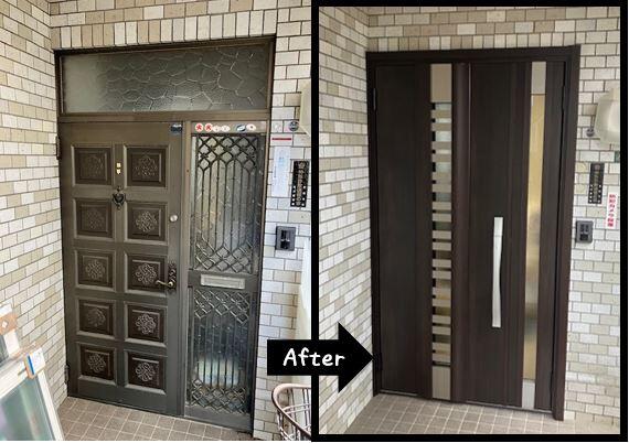 お家の顔となる玄関ホール。重厚感ある木目調の壁と木製の下駄箱がついておりましたが、こちらも使い勝手のいい玄関収納にリフォームさせていただきました♪木目調で暗くなりがちな玄関でしたが白いクロスにするとパッと明るくなり、木目調だった床もヌーディーベージュのフロア材を使いクリエモカの建具との相性もばっちりです!