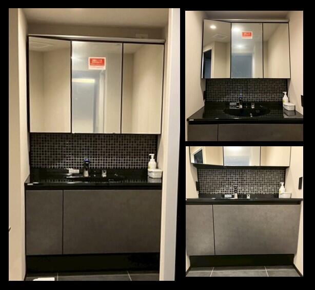 【採用洗面化粧台】『LIXIL ルミシス ボウル一体タイプ』(扉:グレインブラック カウンター:パールブラック キャビネット:ブラック)鏡と洗面ボウルのバックパネルにモザイクタイルを貼ることでさらに高級感がUPします。