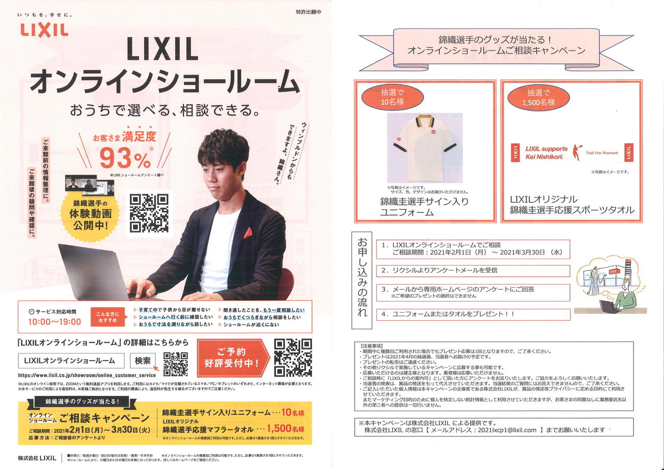 2021年3月30日(火)まで『錦織選手グッズ』が当たるキャンペーンもございますので気になるお客様は是非ご利用ください♪