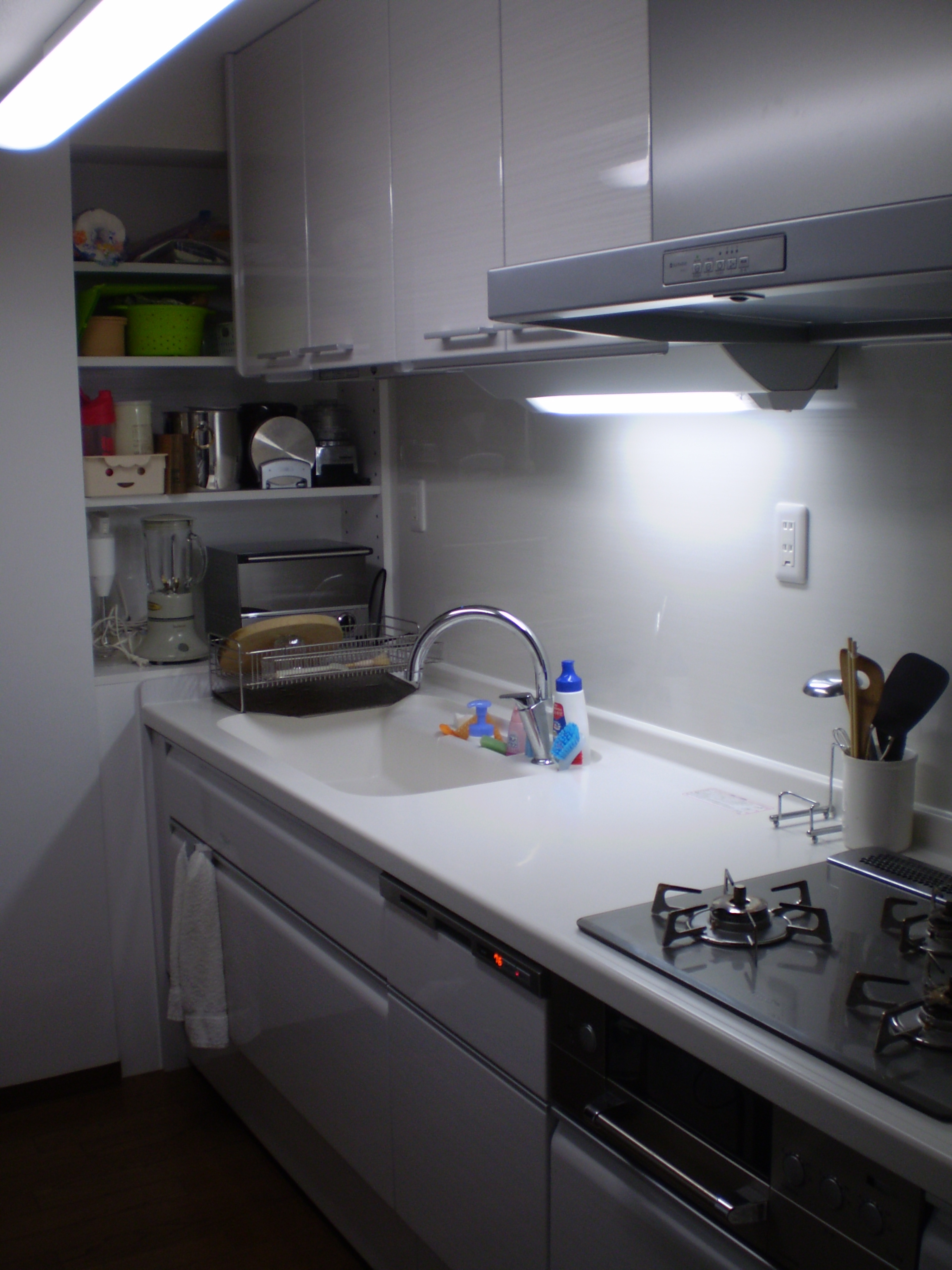 収納スペースが少ないとの相談を受けました。カウンター上に置いているキッチン用品を調べ、システムキッチンや左手奥のデッドスペース収納に振り分けて、収納がすっきりしたキッチンプランを提案しました。