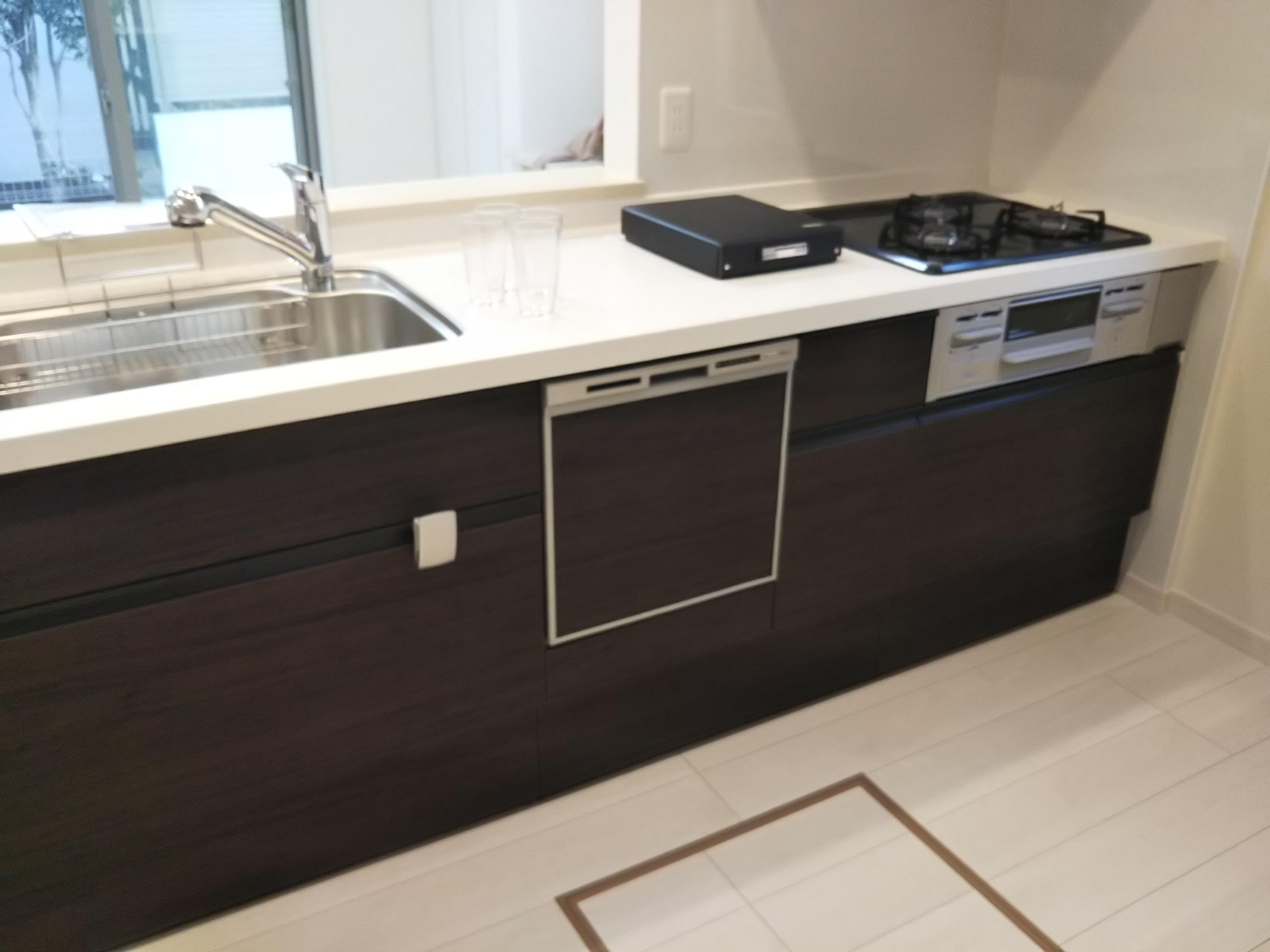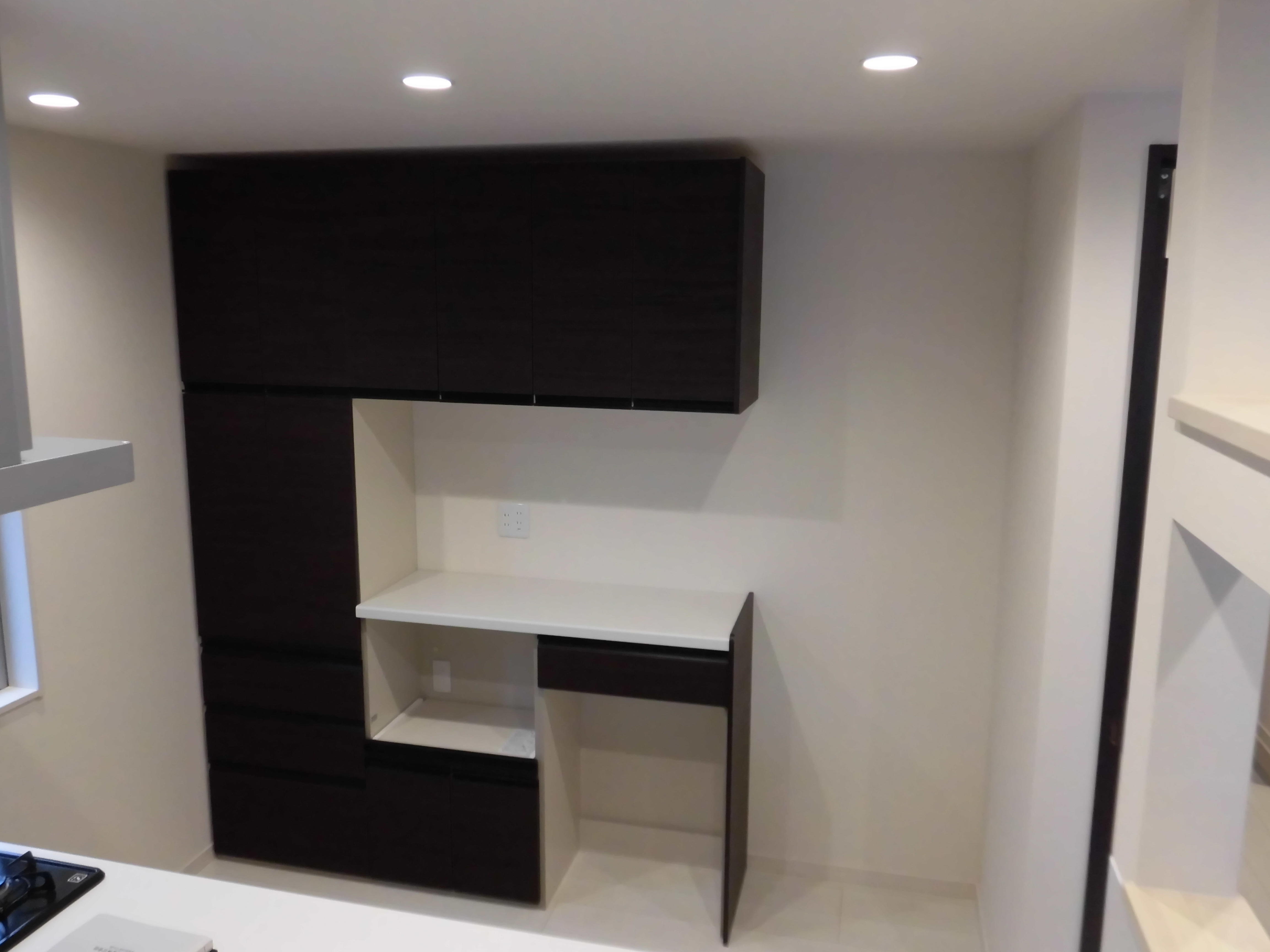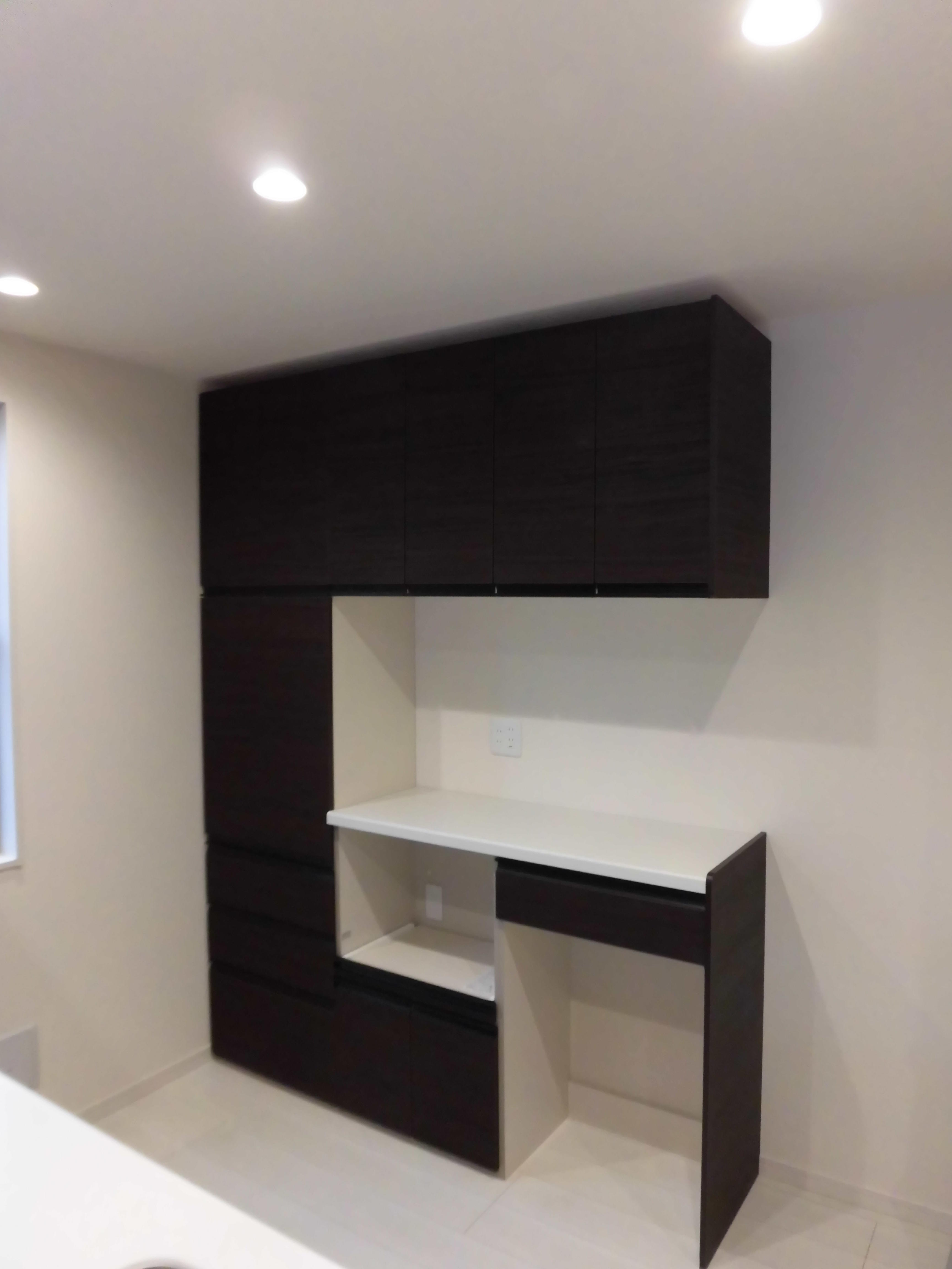 新築建売住宅のシステムキッチンに、扉色を合わせたカップボード及び家電収納を設置しました。