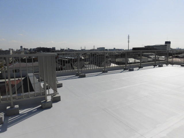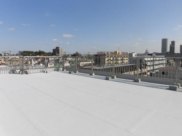 台風の災害で屋上のアルミ手摺を復旧しました。 アルミ手摺の基礎が動いてシート防水を傷つけてしまったので、防水の補修工事も行いました。