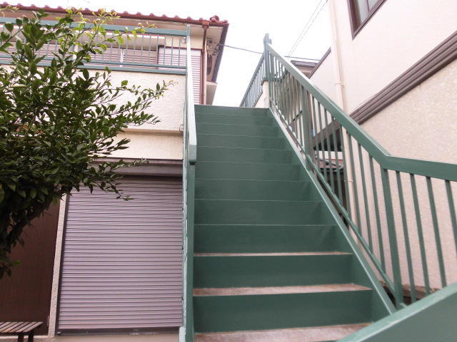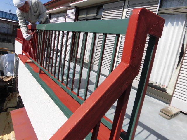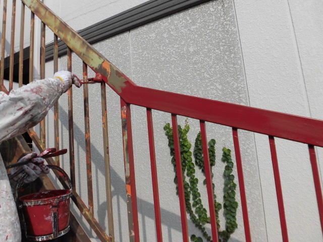 鉄製手摺は外壁より早く塗装が劣化します。鉄部の錆を進まないように塗り替えリフォームを行っています。