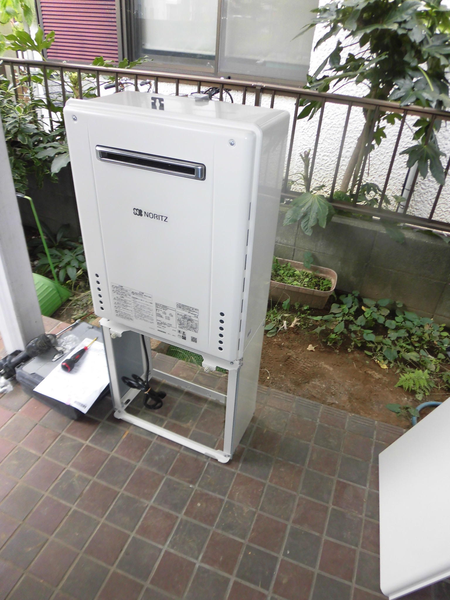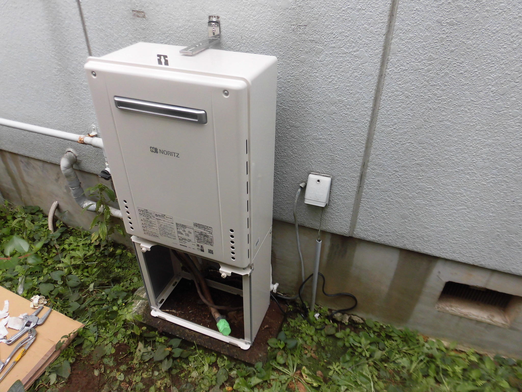 給湯器には置き型のタイプもありましたが、給水給湯・ガス配管をそのまま使えるように既存に合わせて置き架台を取り付けました。