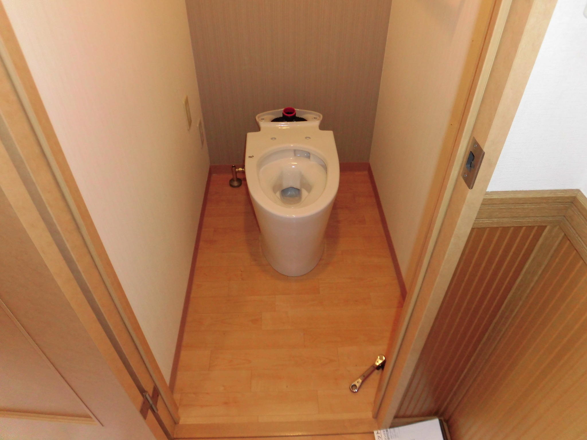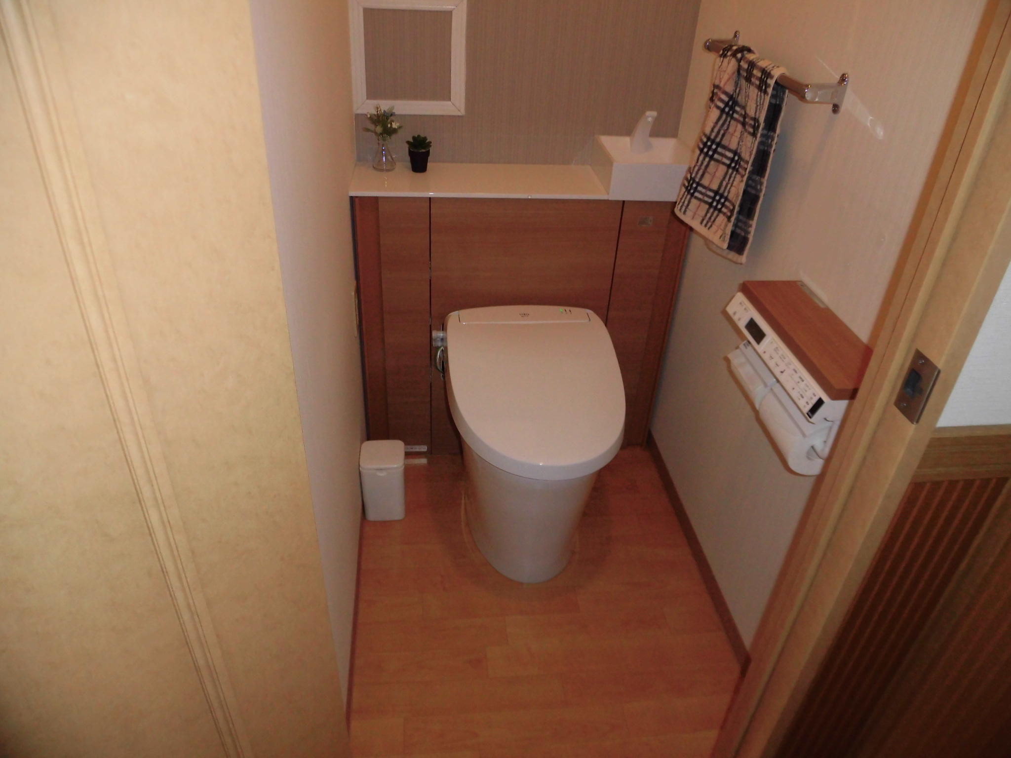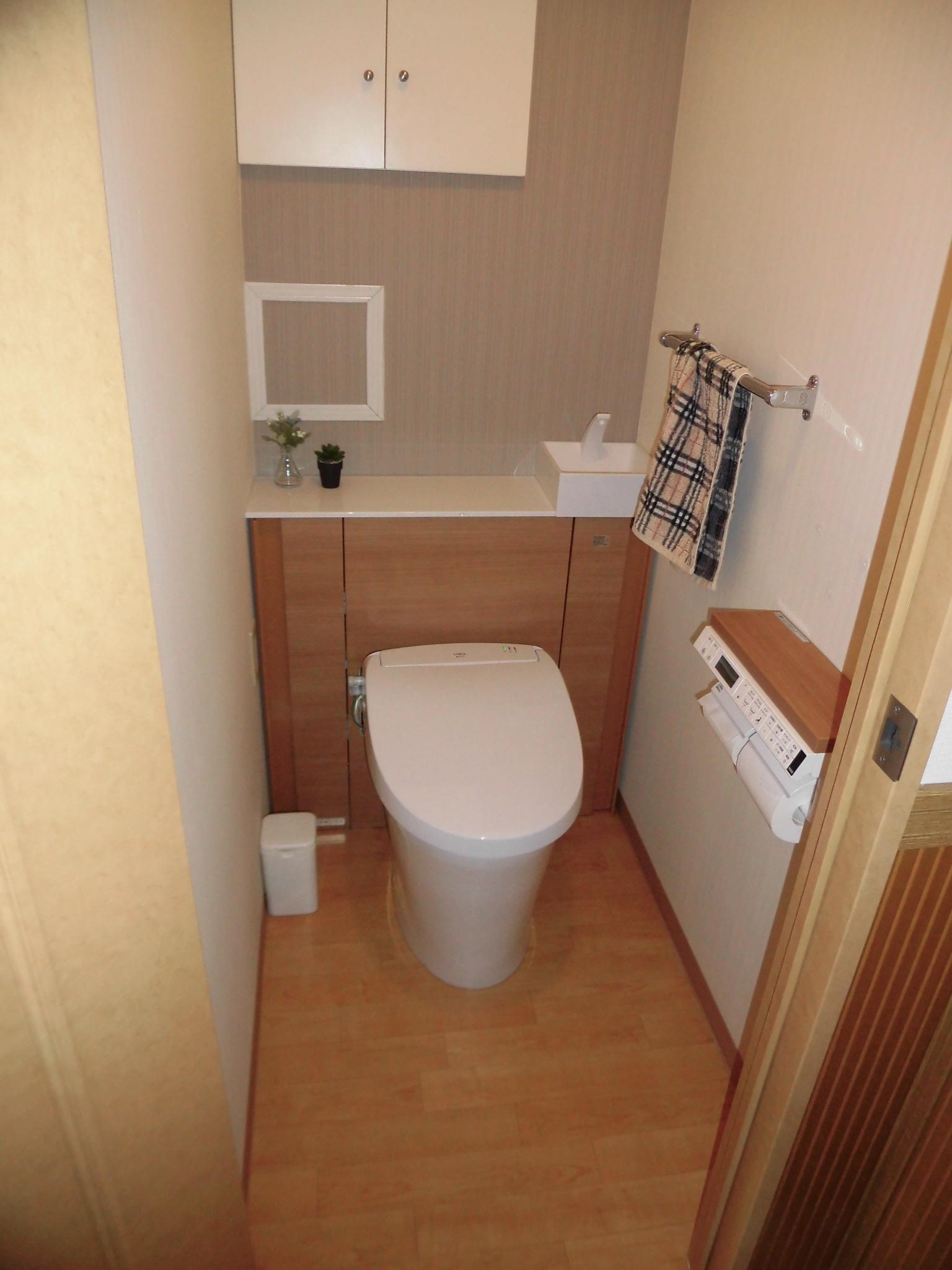 内装は既存のままで、キャビネット付便器(リフォレ)に交換しました。床材の継ぎ目が隠れるようにリトイレタイプの便器を使いました。