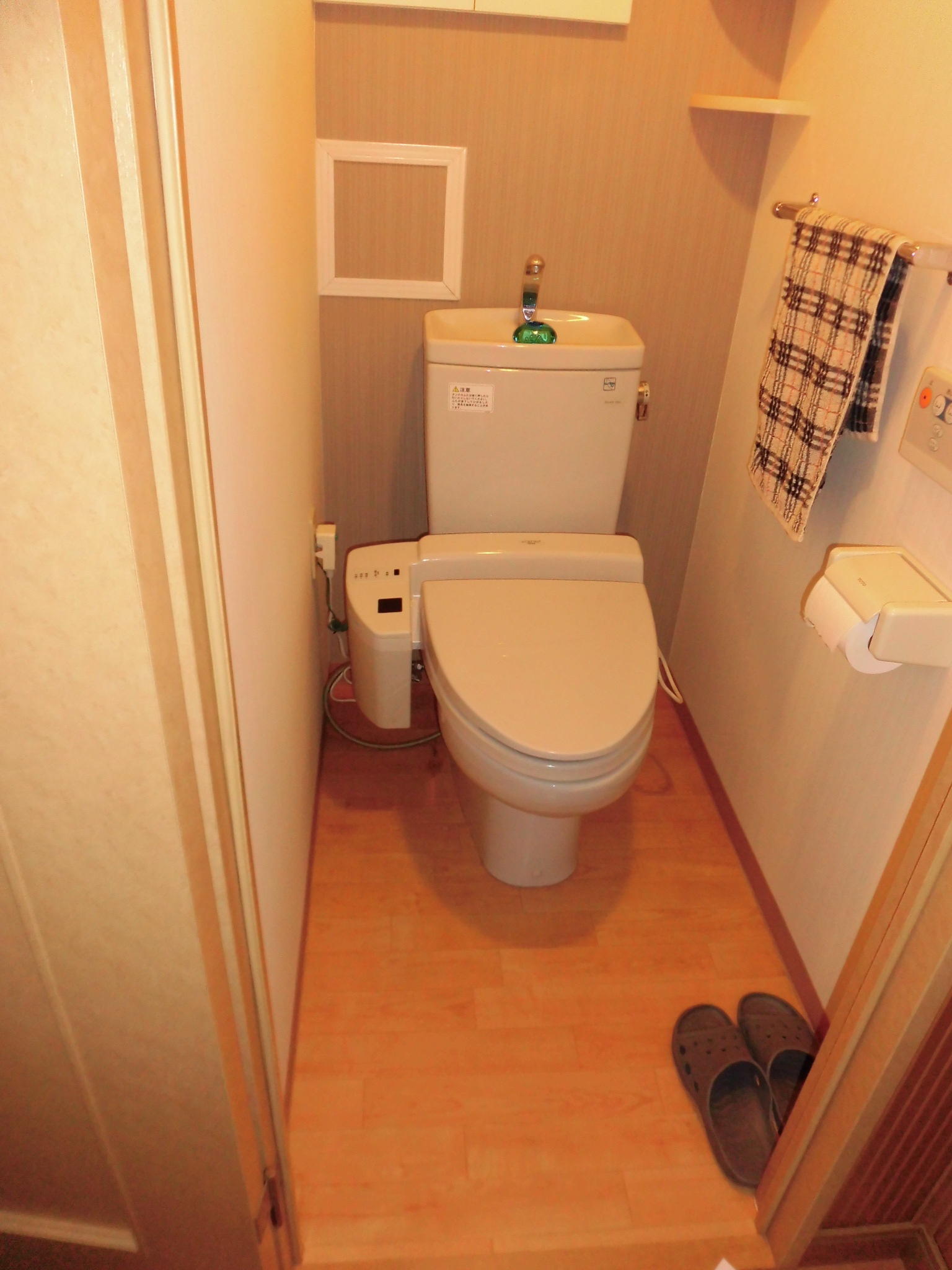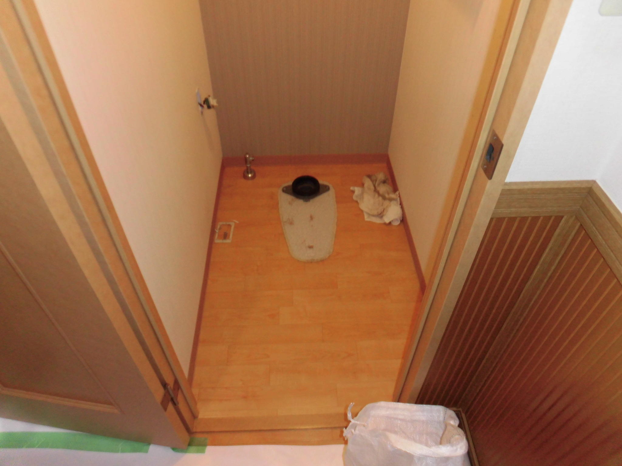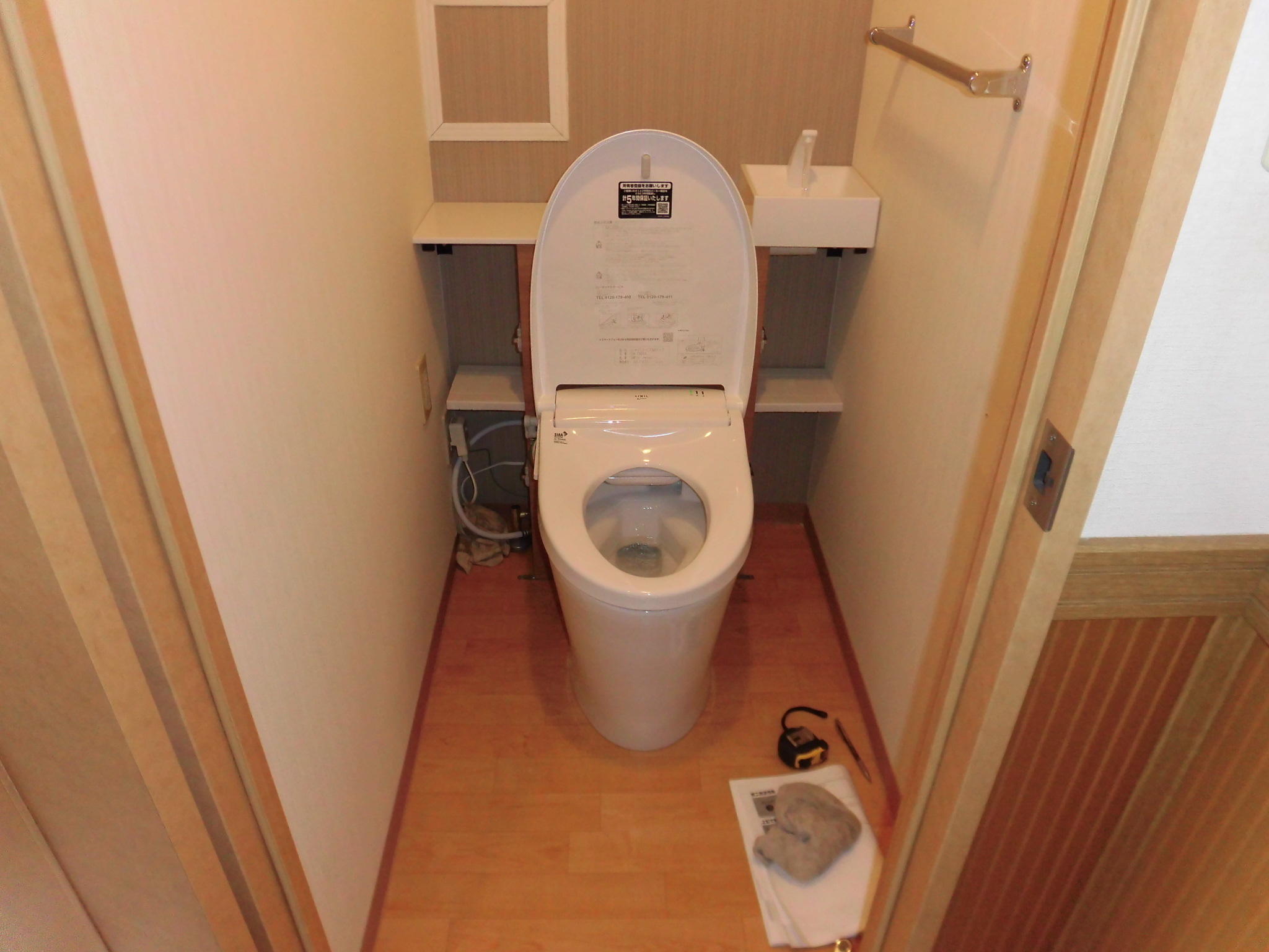 内装は既存のままで、キャビネット付便器(リフォレ)に交換しました。床材の継ぎ目が隠れるようにリトイレタイプの便器を使いました。