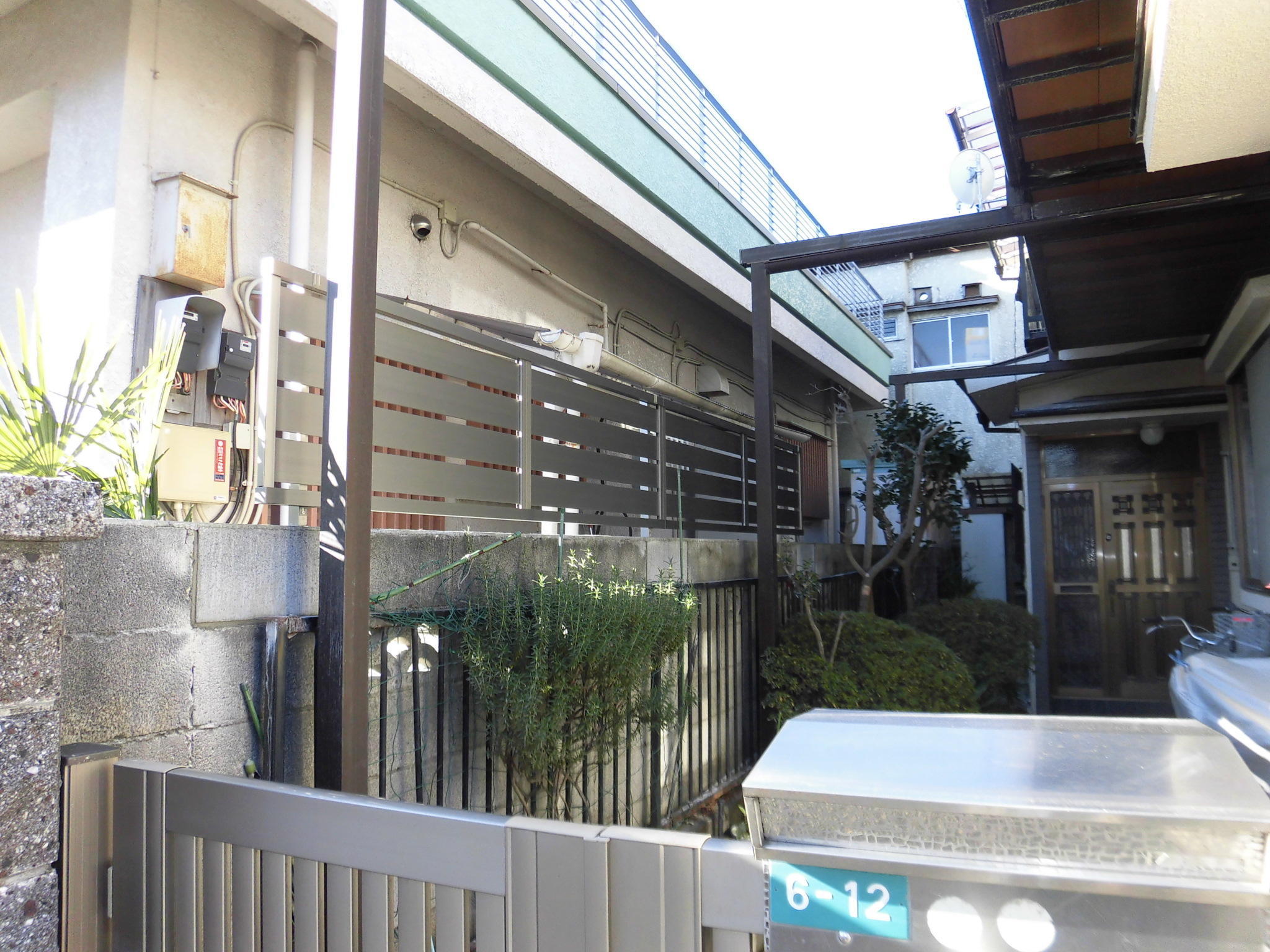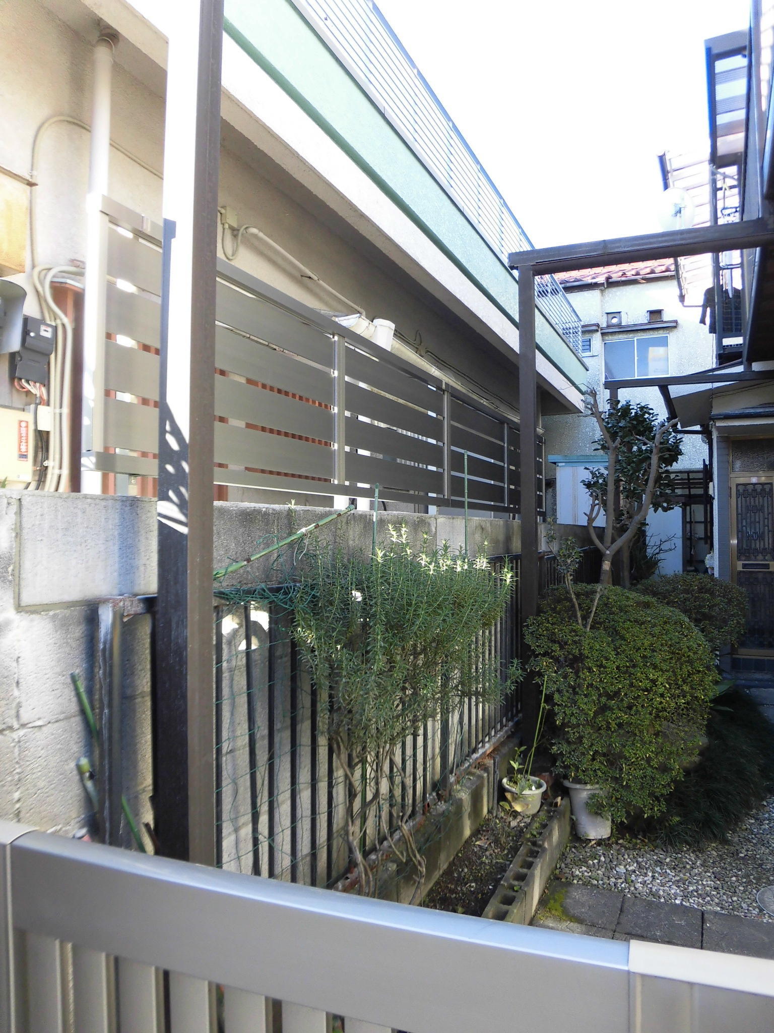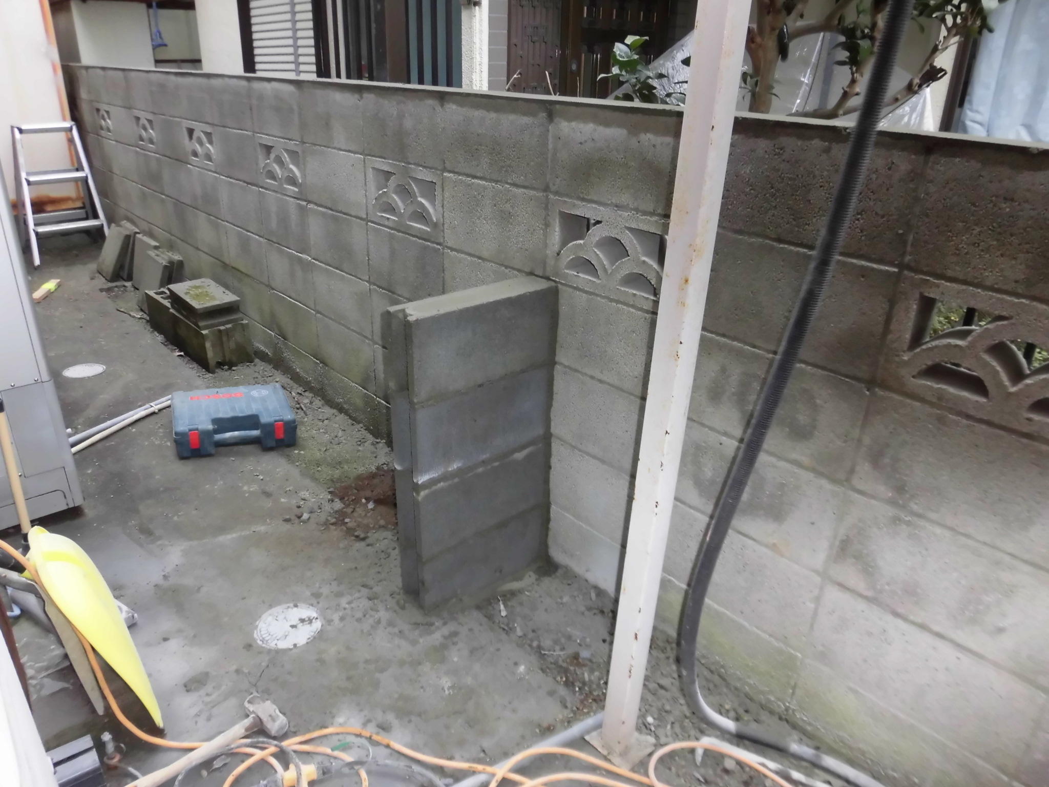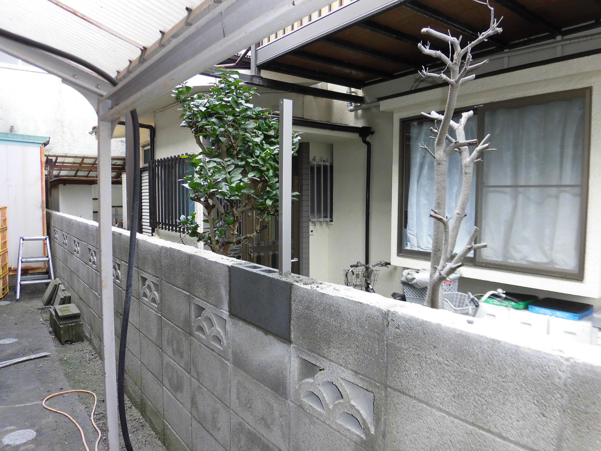 高すぎた隣地境界ブロックを2段撤去し、浴室前にフェンスを設置しました。耐震補強としてブロック控えも新設しました。