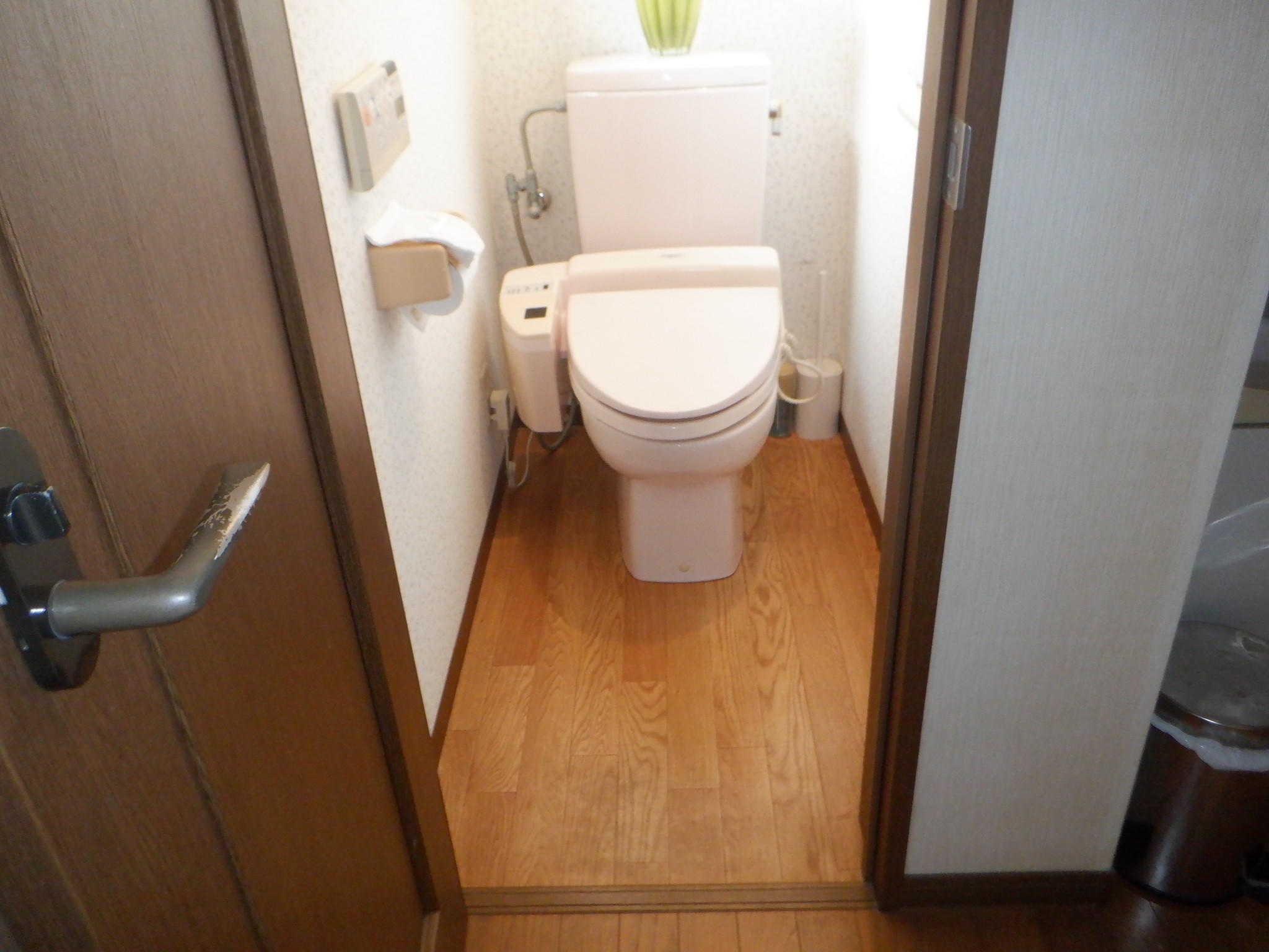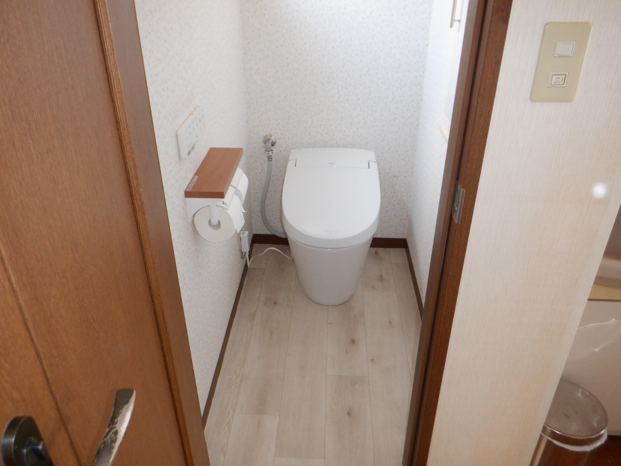 トイレの扉の隣に洗面台があるので、タンクレストイレにリフォームをしました。