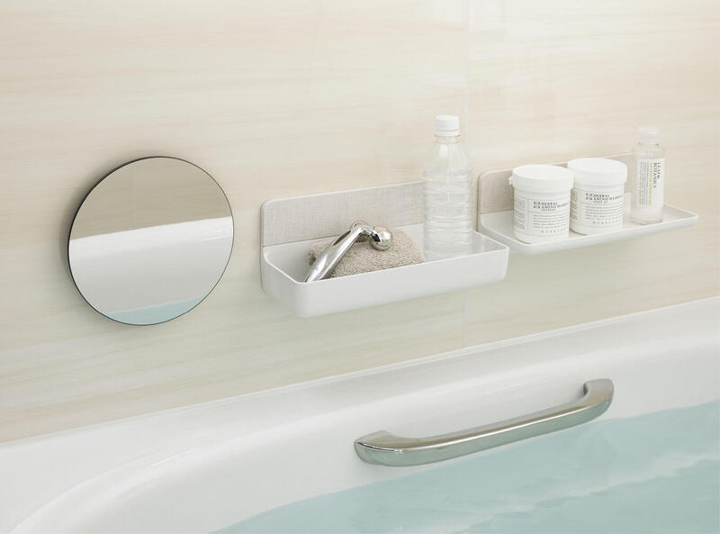 小さなラウンドミラーやポケット、シェルフを浴槽に浸かりながら手の届きやすい位置に設置をしてセルフケアやバスタイムを楽しむアイテムを置いておくことができちゃいます。