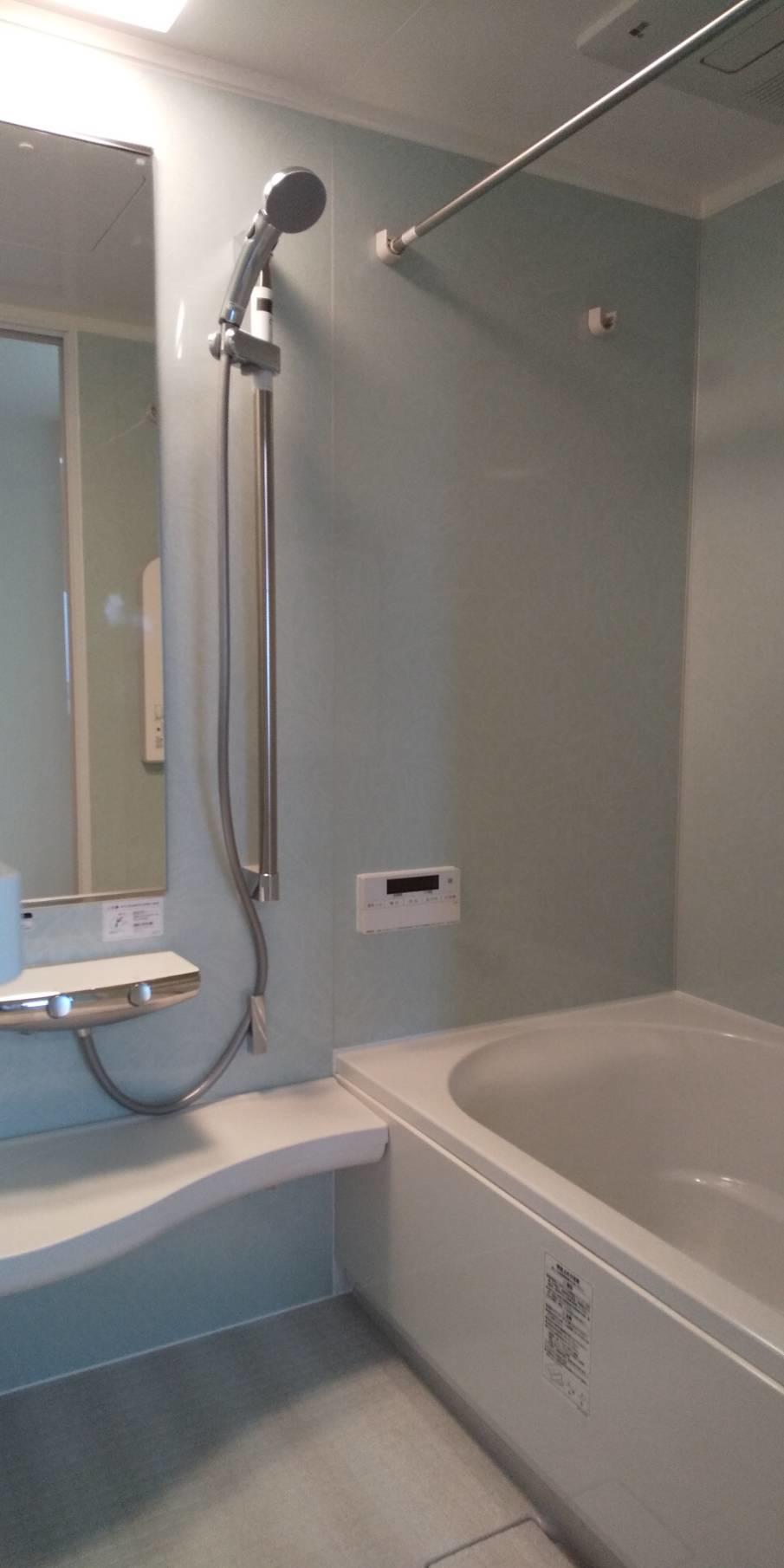 以前のお風呂は収納の形も限られ、全体的に暗めなイメージでしたが、広々とした空間でお掃除もしやすいお風呂に生まれ変わりました。収納棚とカウンターがついたことで使い勝手も良く、壁パネルも明るいカラーが素敵で清潔感がありますね!毎日のお風呂タイムにリラックスできそうです♪