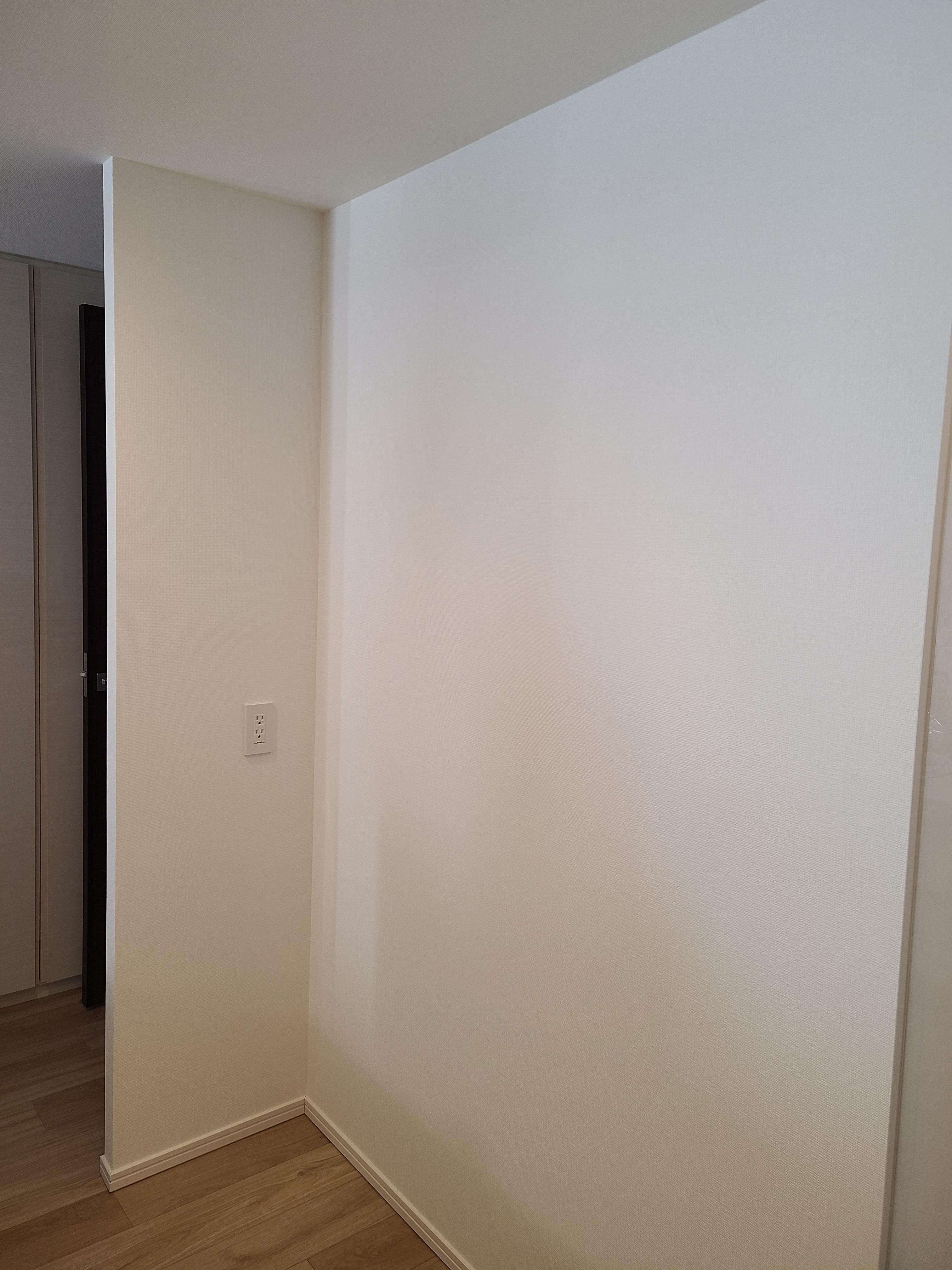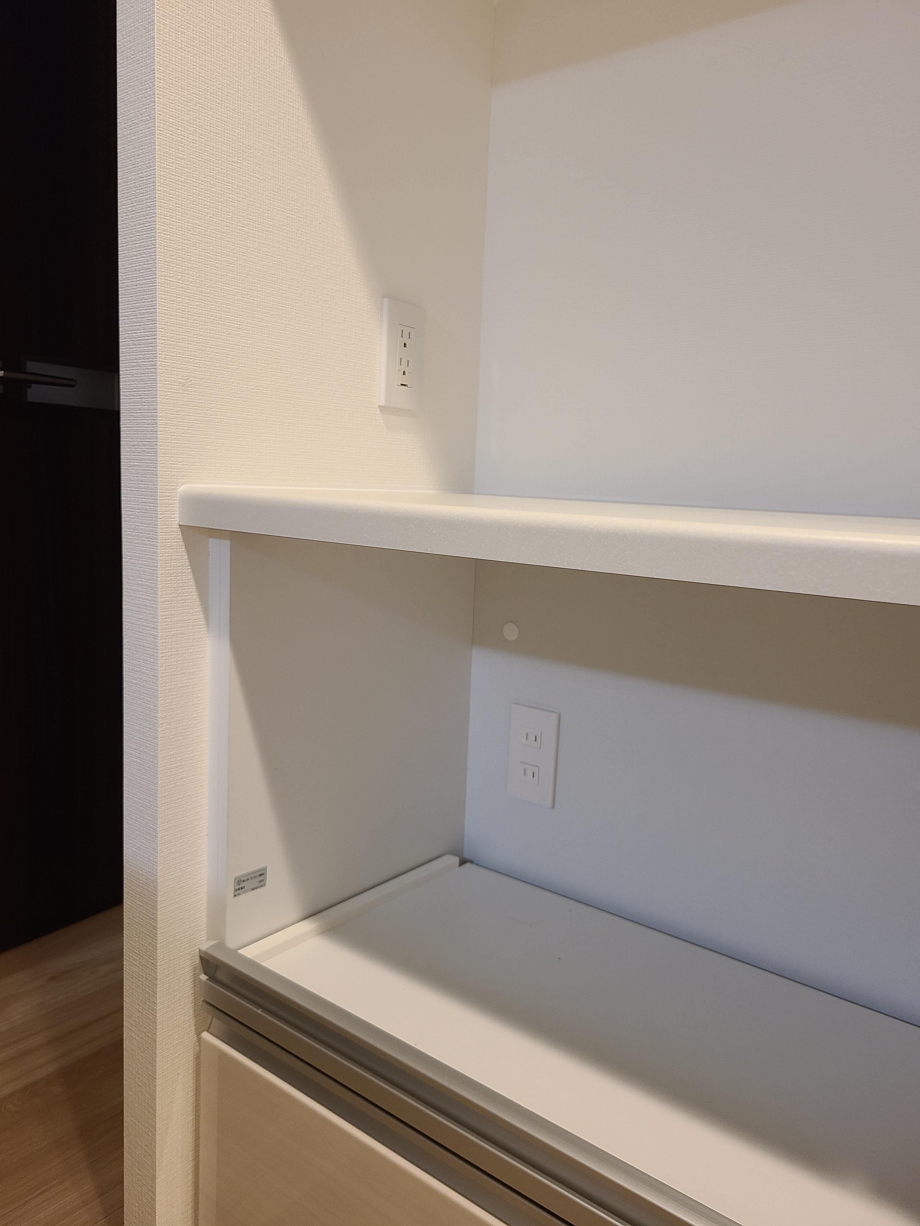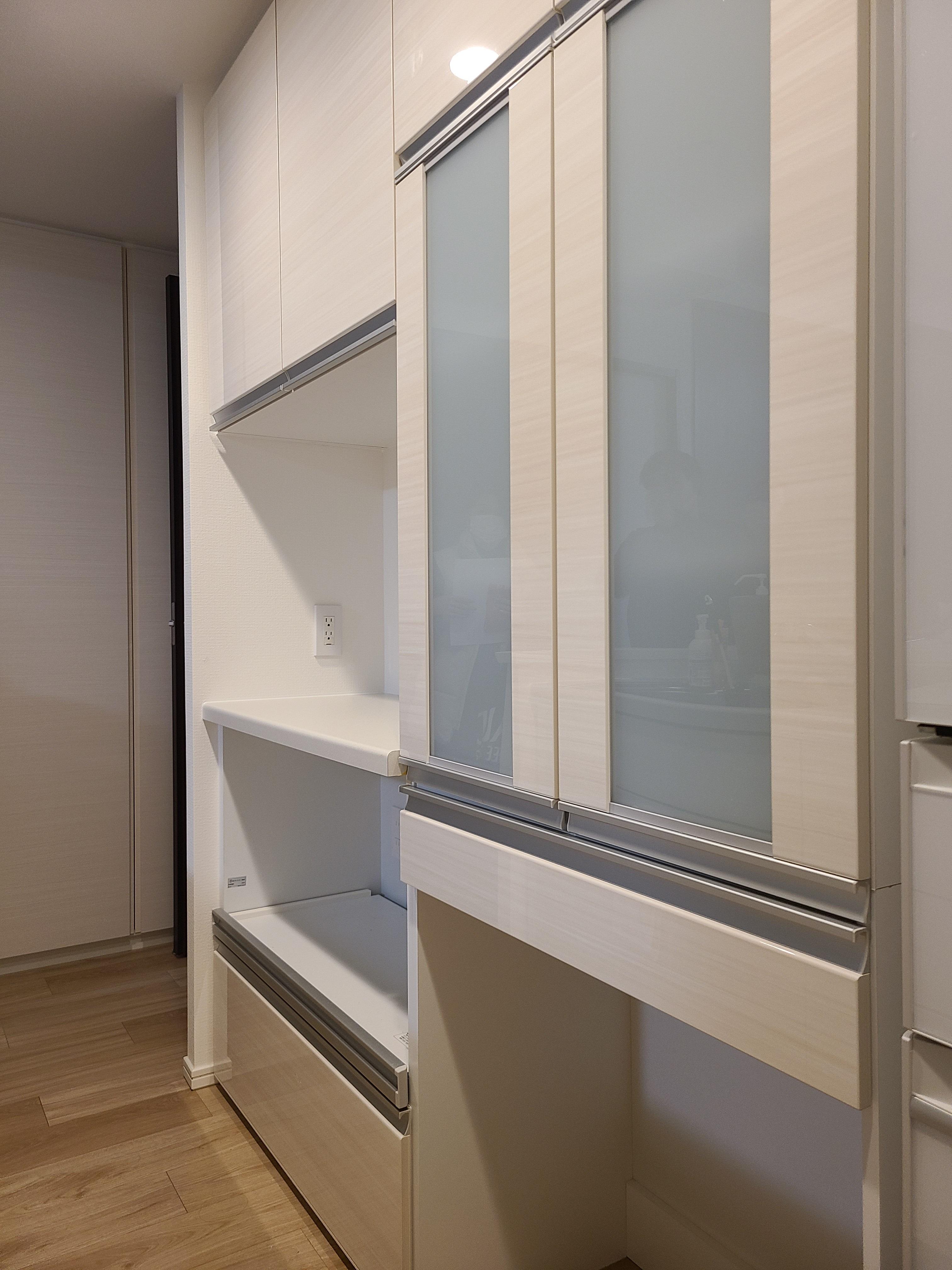 新築マンションでキッチンに収納がなく、カップボードの設置依頼をいただきました!今回は家電の収納スペースに合わせてコンセントも増設いたしました。