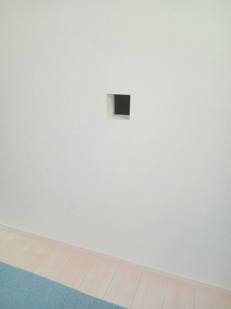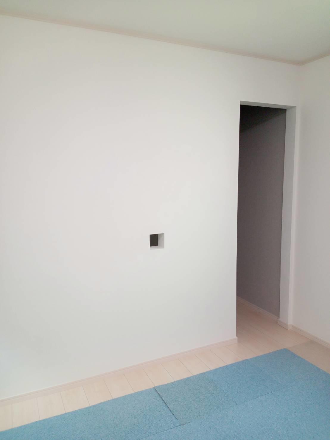 そして壁に開けた四角の穴にはひと工夫が。壁掛けテレビ設置時の配線を通す穴を作りました!壁掛けテレビは配線の目隠しに困りますが、これでスッキリです♪