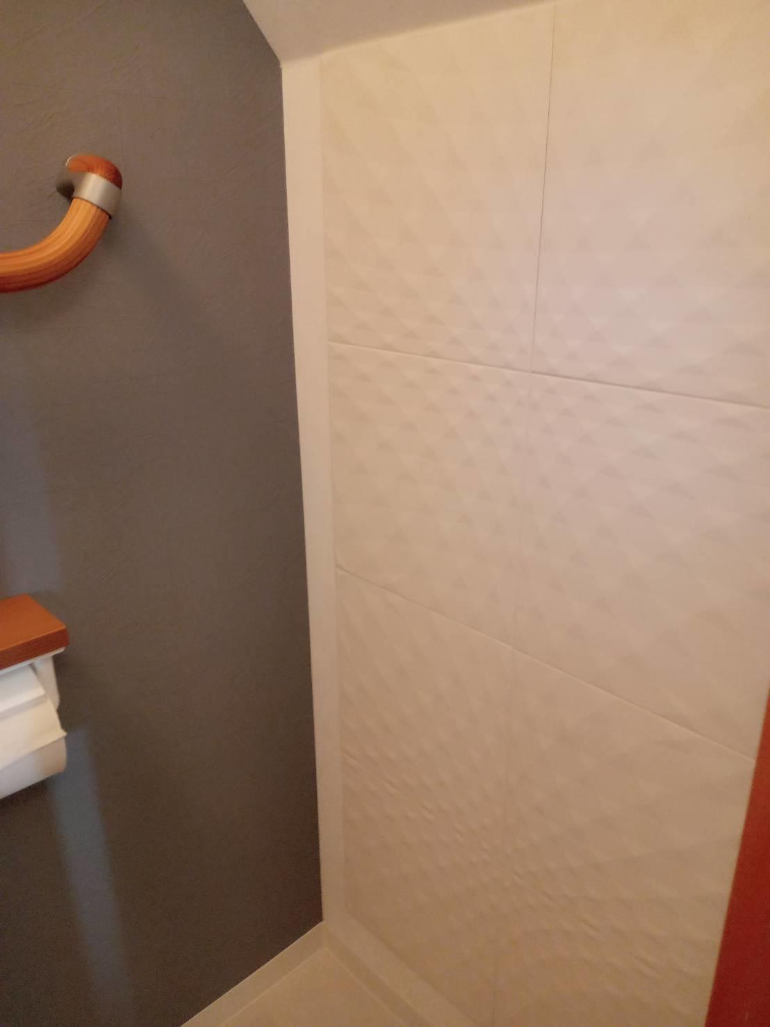 エコカラットプラスには『ニュートランス(ホワイト)』を採用しました。貼り方にも一工夫。こちらもお客様からのリクエストで放射状になるような形で貼らせていただきました。これがまた素敵なんです☆エコカラットの白にグレーの壁紙がアクセントとなり、凄くオシャレでスタイリッシュなトイレになりました。