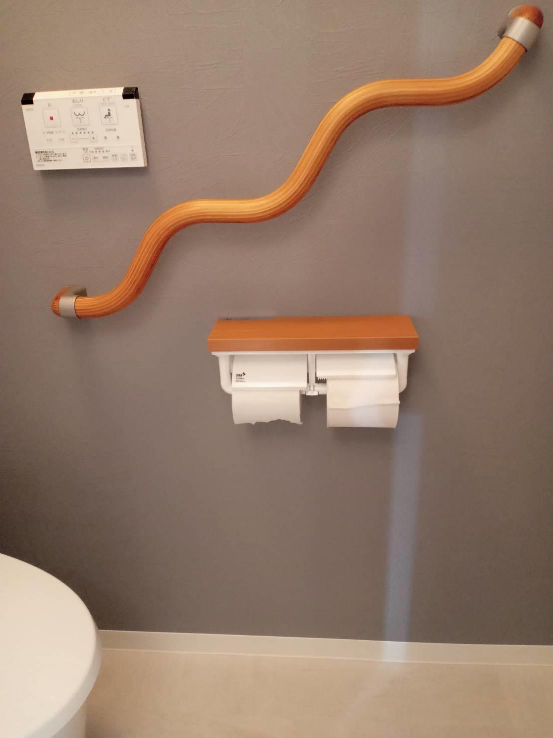 波形の手すりはお客様のリクエストで、クネットというメーカーの手すりを設置しました。クネットの波形手すりは、まっすぐな手すりと比べて握った時の手首の確度が自然なため、握り込みやすく、滑りにくい設計になっているそうです。なみなみの見た目もとってもかわいいですね!