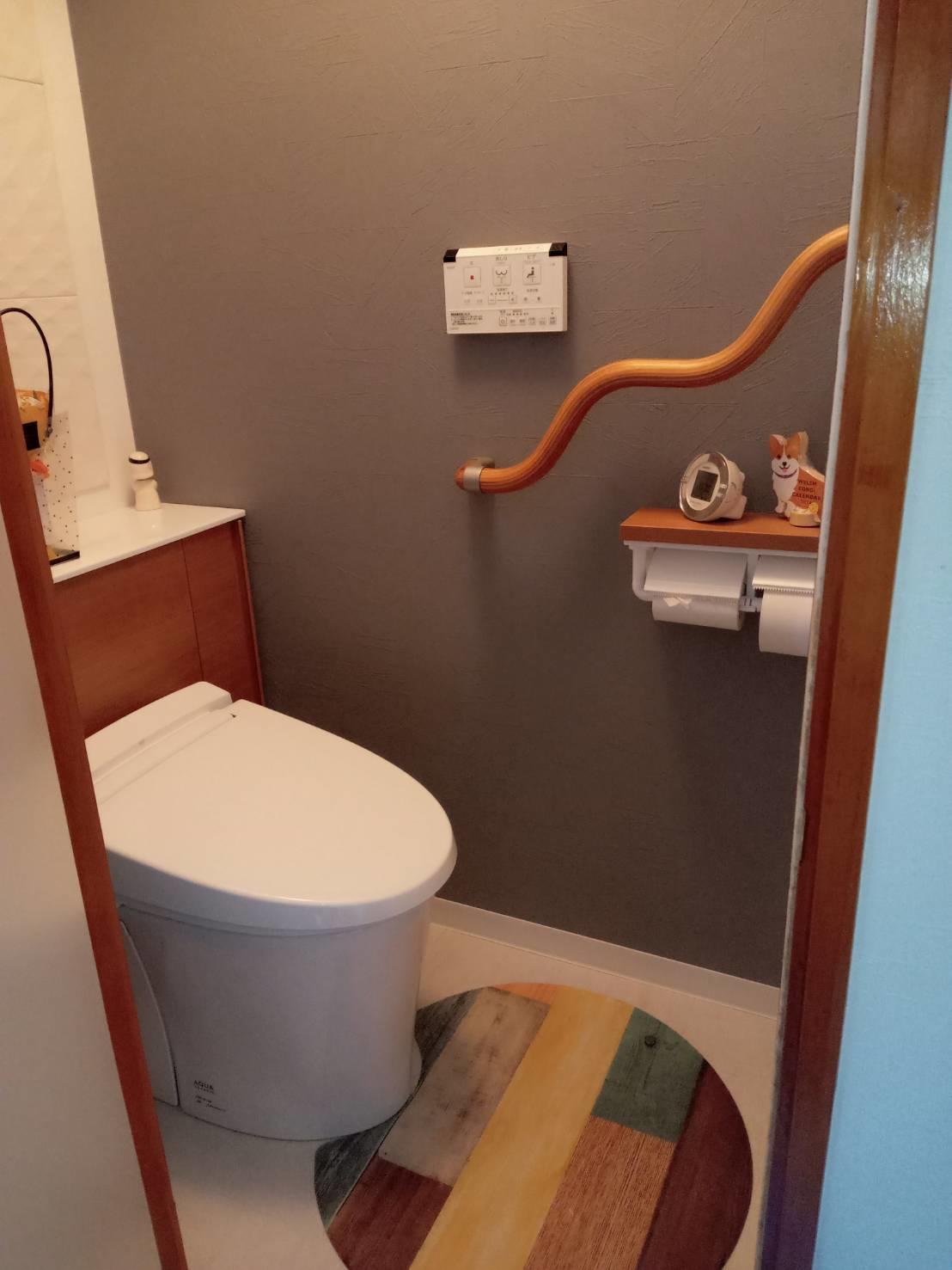 トイレの老朽化に伴い、リフォームのご依頼をいただきました。今回はトイレと吊り戸を交換し、手すりとエコカラットプラスを設置しました。床にはフロアタイルを貼り、壁紙もアクセントにグレーを利かせて張り替えました。