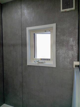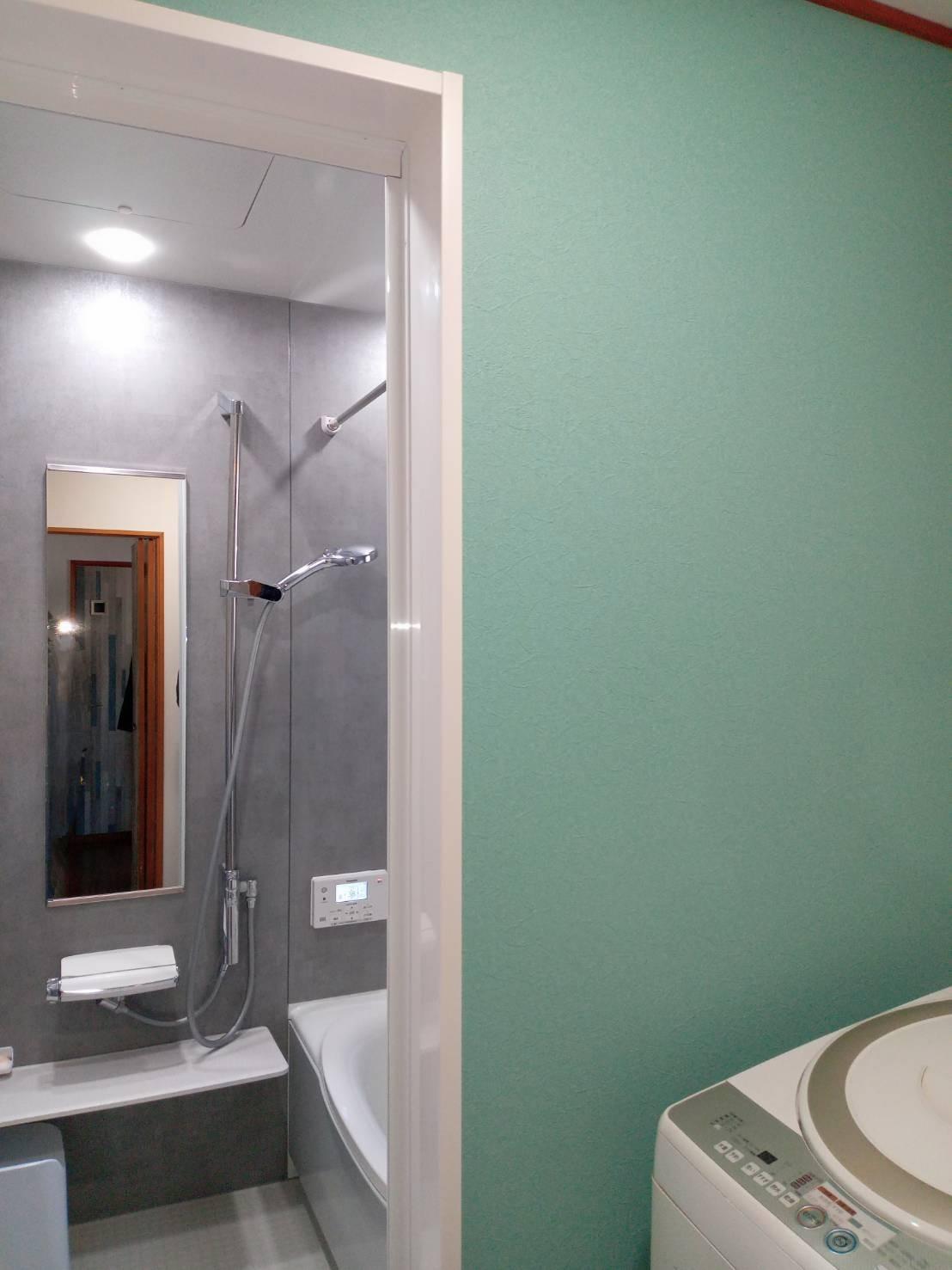浴室リフォームの際、工事の過程でユニットバスを入れるのに壁を壊す必要があります。今回は壁の補修と一緒にご希望のクロスを貼らせていただきました。グリーンがアクセントになって、とっても可愛いです!