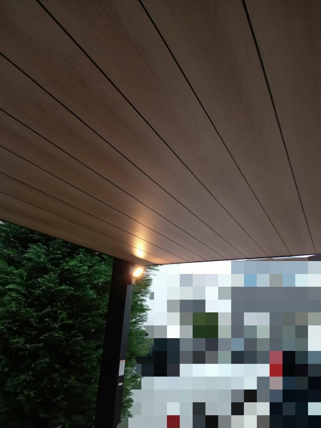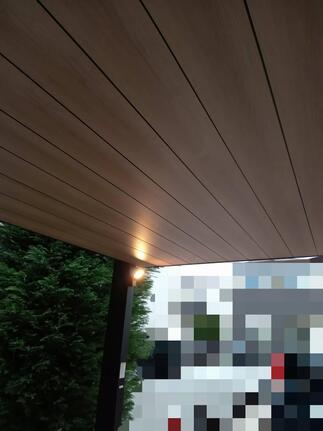 こちらは21-29型の標準柱で、カラーはチェリーウッド+ブラックになります。カーポートSCならではのフラットな天井面を、天然木を思わせるナチュラルな木目色で仕上げています。天井面の木目が可愛くて、玄関アプローチの雰囲気にもピッタリです♪