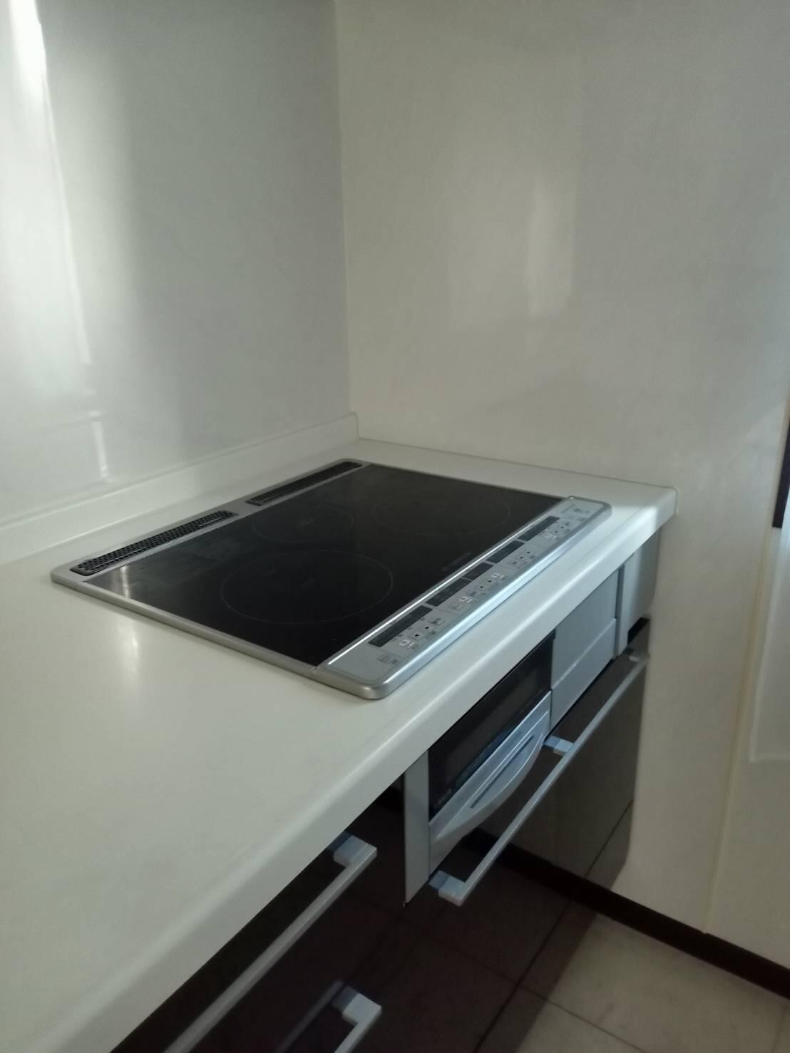カウンターにはクリスタルカウンターを採用しました。こちらは非常に熱に強い素材で作られており、衝撃にも強い丈夫な素材でお手入れもしやすく使いやすいのが特長です。カウンターカラーはカラカッタカロレを選びました。大理石の美しい流れ模様を柔らかく浮かび上がらせた柄となり、光がさす具合によって様々な表情を見せてくれます。