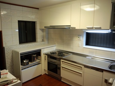 サンウエーブのリシェルを使用しました。お客様の希望により、キッチンの壁はパネルではなくタイルを使用。タイルを使用する事によって高級感・重厚感が出ました。そして、清掃性を高める為に大判タイルを使用し、目地を少なくしました。