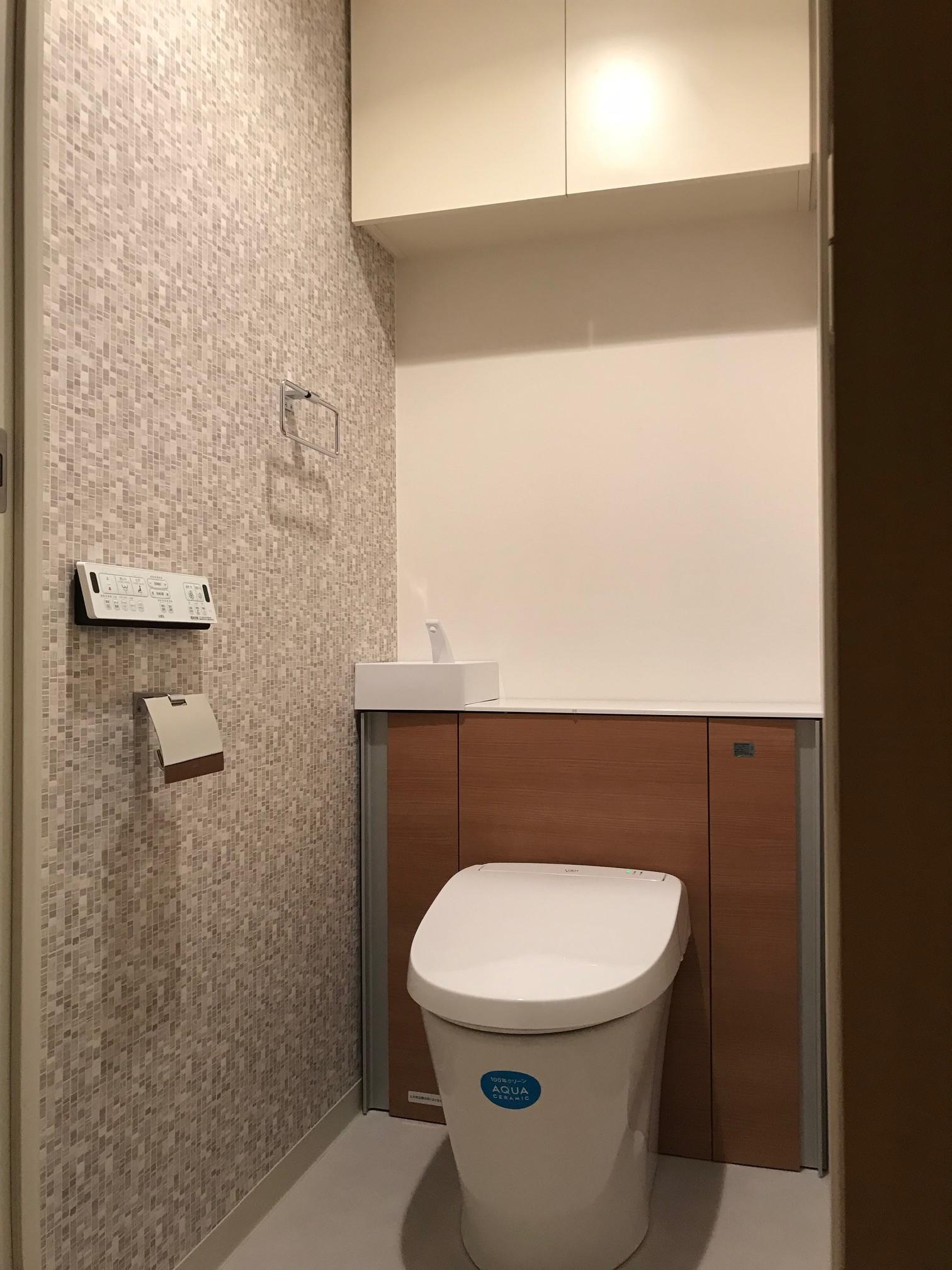 内装仕上げはお客様ご自身が選ばれました。 アクセントクロスでセンスの良いスタイリッシュなトイレに生まれ変わりました!