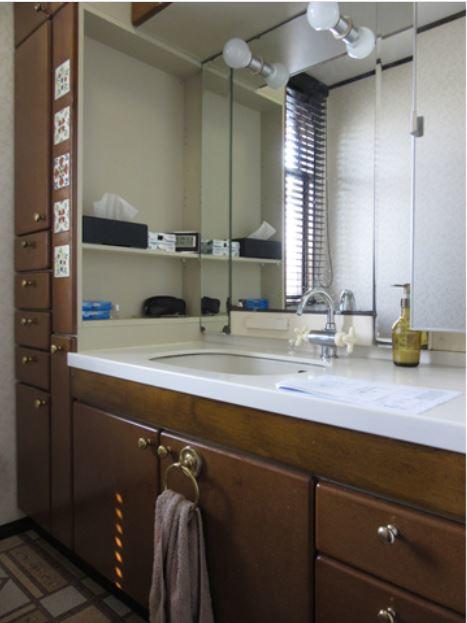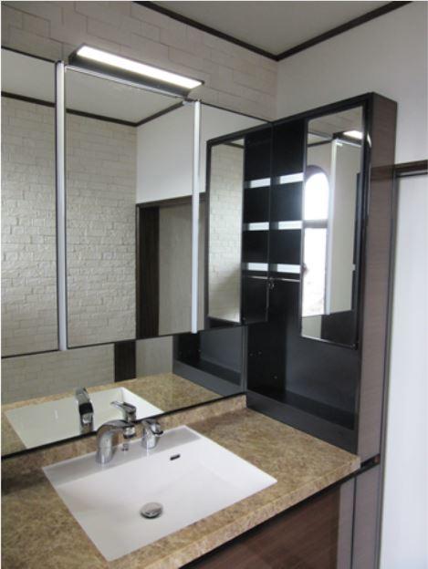 ショールームで一目ぼれされた洗面化粧台「ルミシス」の設置を熱望。 高級感あふれる「ルミシス」がとってもお似合いのお宅でした。 少し隙間ができた引戸部へは、ドア枠と一体に見えるよう、エンドパネルで一工夫して加工しました。 「エコカラット」もいくつかの配置パターンをご提案させていただき、採用いただきました。