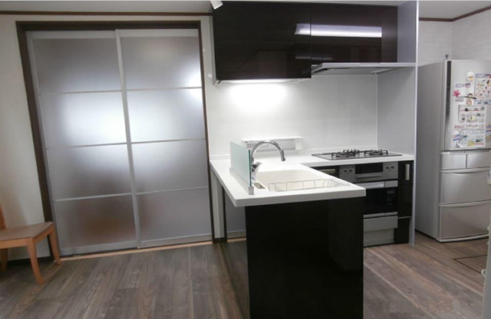 キッチンとリビングの間の壁を解体し、対面式のL型キッチンに。 和室とリビングの4枚建ての建具を、高さがあって半透明の2枚引込戸にしました。そのことによって、リビング・キッチン・和室を一体化し、どこにいても顔が見える空間となりました。 リビングの入口、トイレの敷居を撤去し、リビング・玄関ホールの床にフローリングを重ね張りに。 和室の床は上げて畳を敷き、トイレの床はあげて全体にバリアフリーにしました。 モダンで開放的な空間となり、喜んでいただきました。