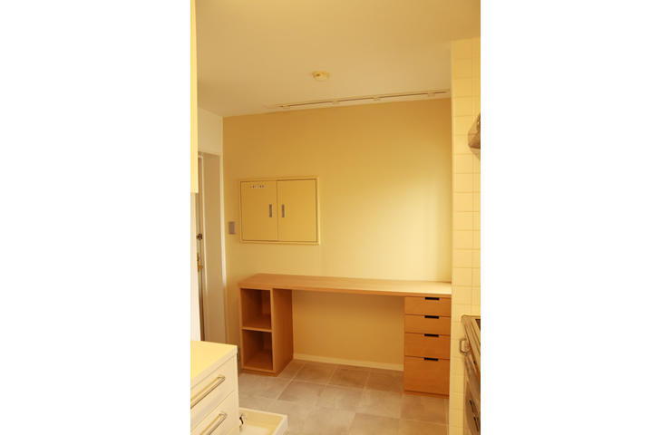 収納物や量、キッチン家電の配置等を考慮し、リビング家具とキッチン収納は造作しました。 キッチンには奥様の家事スペースのための専用デスクを。こちらも造作で。 大きなリビングには、よりくつろげる空間づくりのために天井間接照明をご提案。 また、マンションのため熱源機や配管も問題を解決するため、床暖房は電気式を選択。 壁の塗り替えに加え、カーテンも全部屋一新するご提案を実施しました。