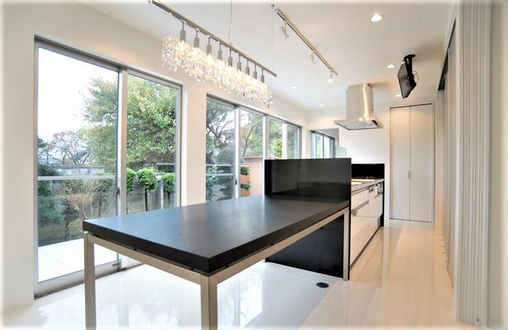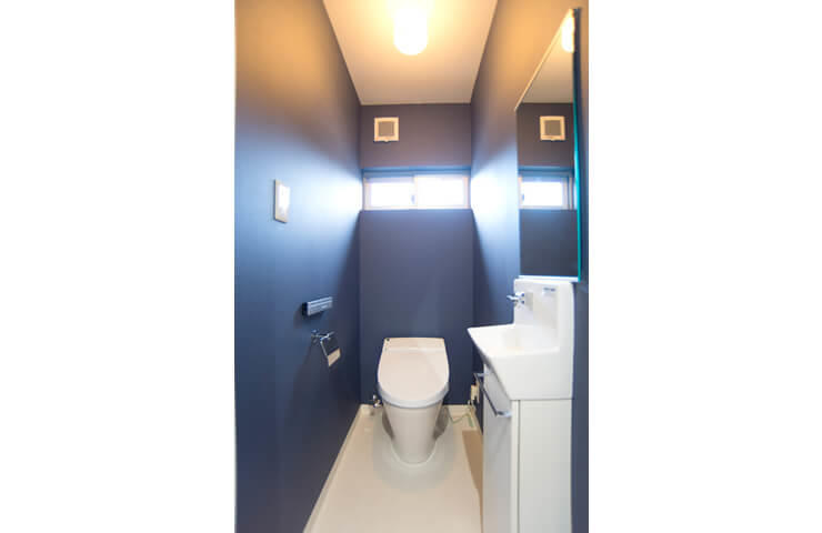 ダイニング・キッチンは、「生活を感じさせないおしゃれな空間にしたい」との施主様のご要望をうかがい、白と黒を基調色にして、床タイルをテラスまで貼り上げて、シンプルで広がりのあるダイニング・キッチンプランをご提案しました。冷蔵庫や食器棚を引戸で間仕切りクローズ収納としました。 リビングは「落ち着く空間」をテーマにシックな色調に。TVボードの下と天井を間接照明でムーデイな空間を演出を。壁面に家族の思い出を飾るニッチ棚を造作しました。 トイレは「遊び心」。壁紙を施主様の好きな青一色にしました。タンクレストイレ採用で奥行きスペース確保。手洗いは収納付デザインをプラスして、使い勝手良く、手入れもしやすくなりました。