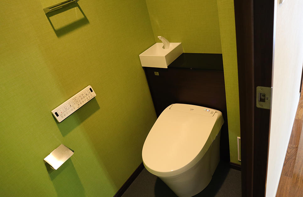 トイレはLIXILキャビネット収納付きトイレ「リフォレ」を採用。壁クロス、床材も緑をご選定されました。仕上がりが締まるように色が濃いキャビネットを採用。