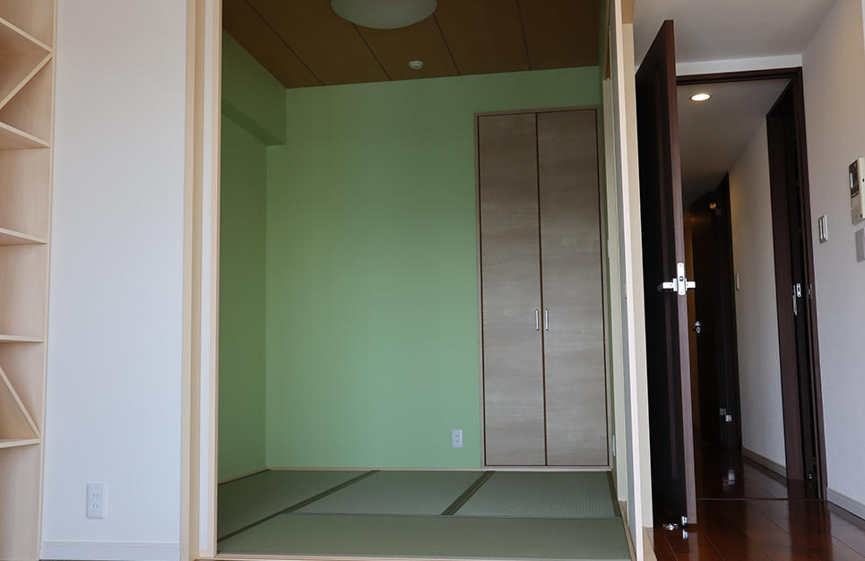 間取り変更で和室を少し小さくし、収納部屋をご提案。和室の壁紙も緑。おうちの所々に緑をちりばめて。緑は気持ちを落ち着かせ、安心と快適さを感じさせる優しく平和な色ですよね。
